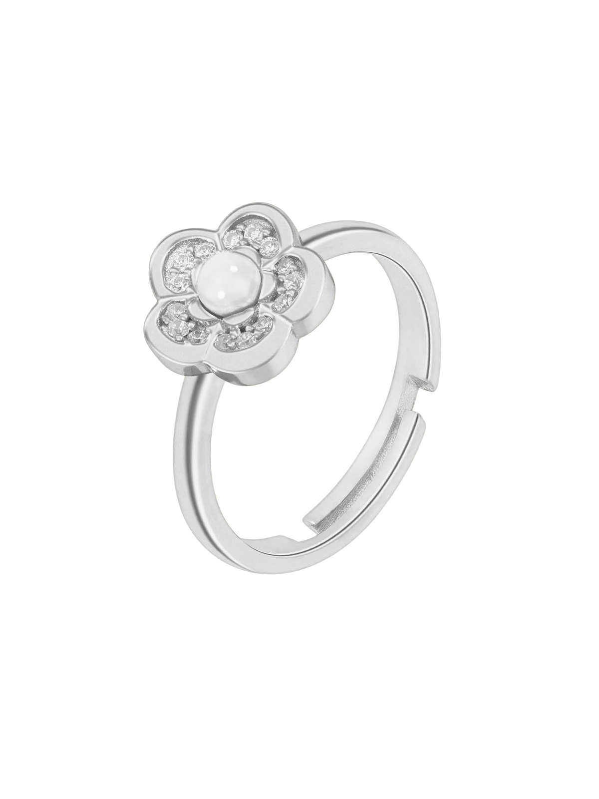 Anillo flor perla. Plata de 1ª Ley rodiada. Circonitas en microengaste.