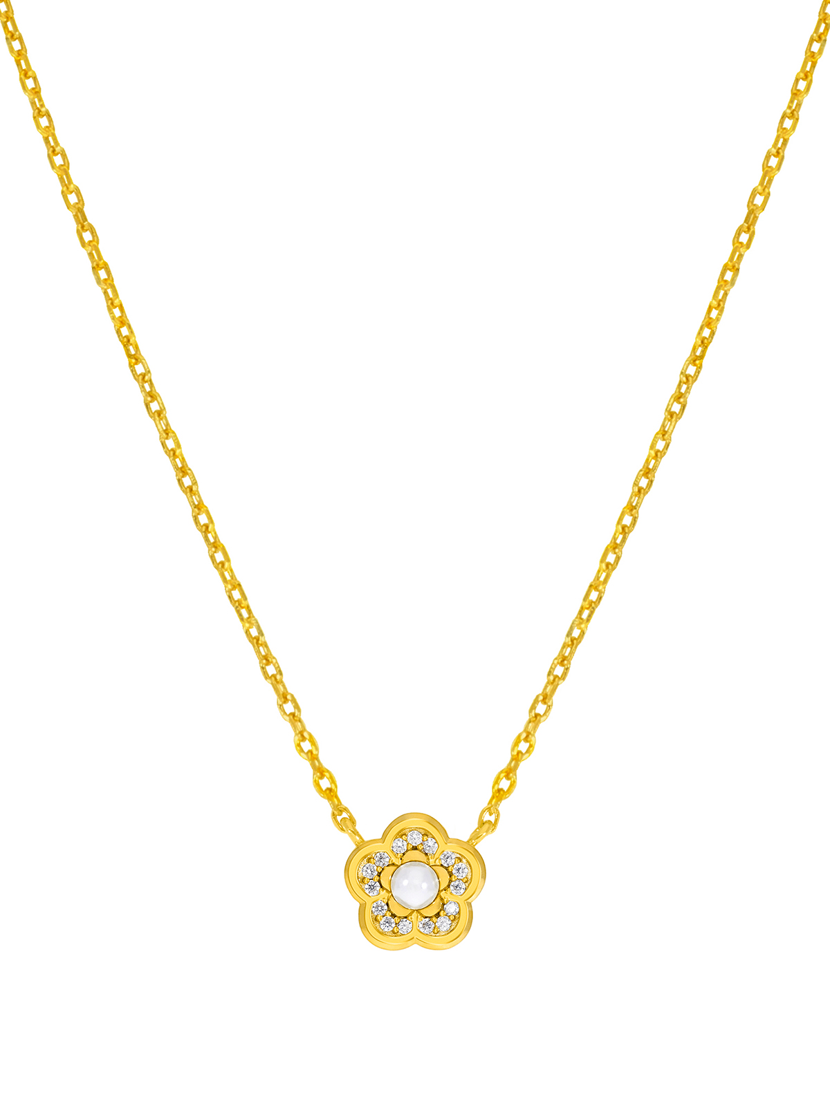 Collar flor perla. Plata de 1ª Ley baño en oro de 18k. Circonitas en microengaste. Cierre mosquetón. Cadena adaptable