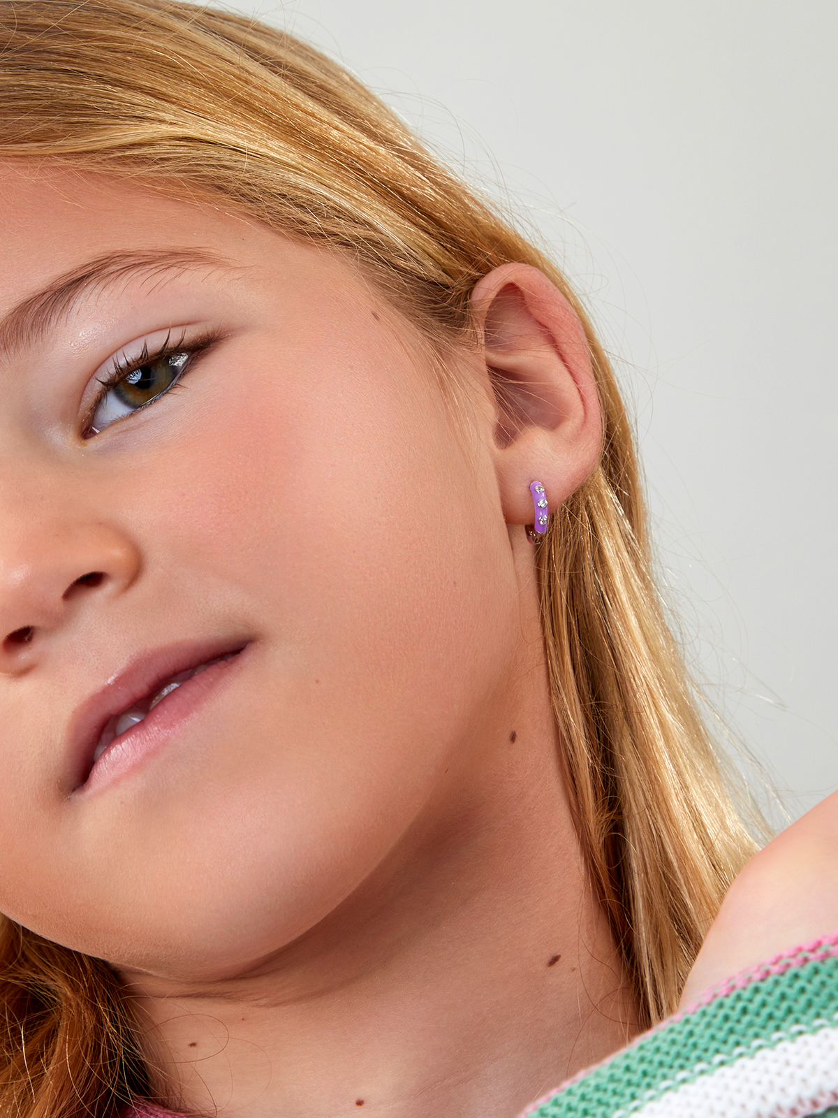 Pendiente hoop circonitas. Plata de 1ª Ley rodiada. Esmalte lila. Cierre huggy.