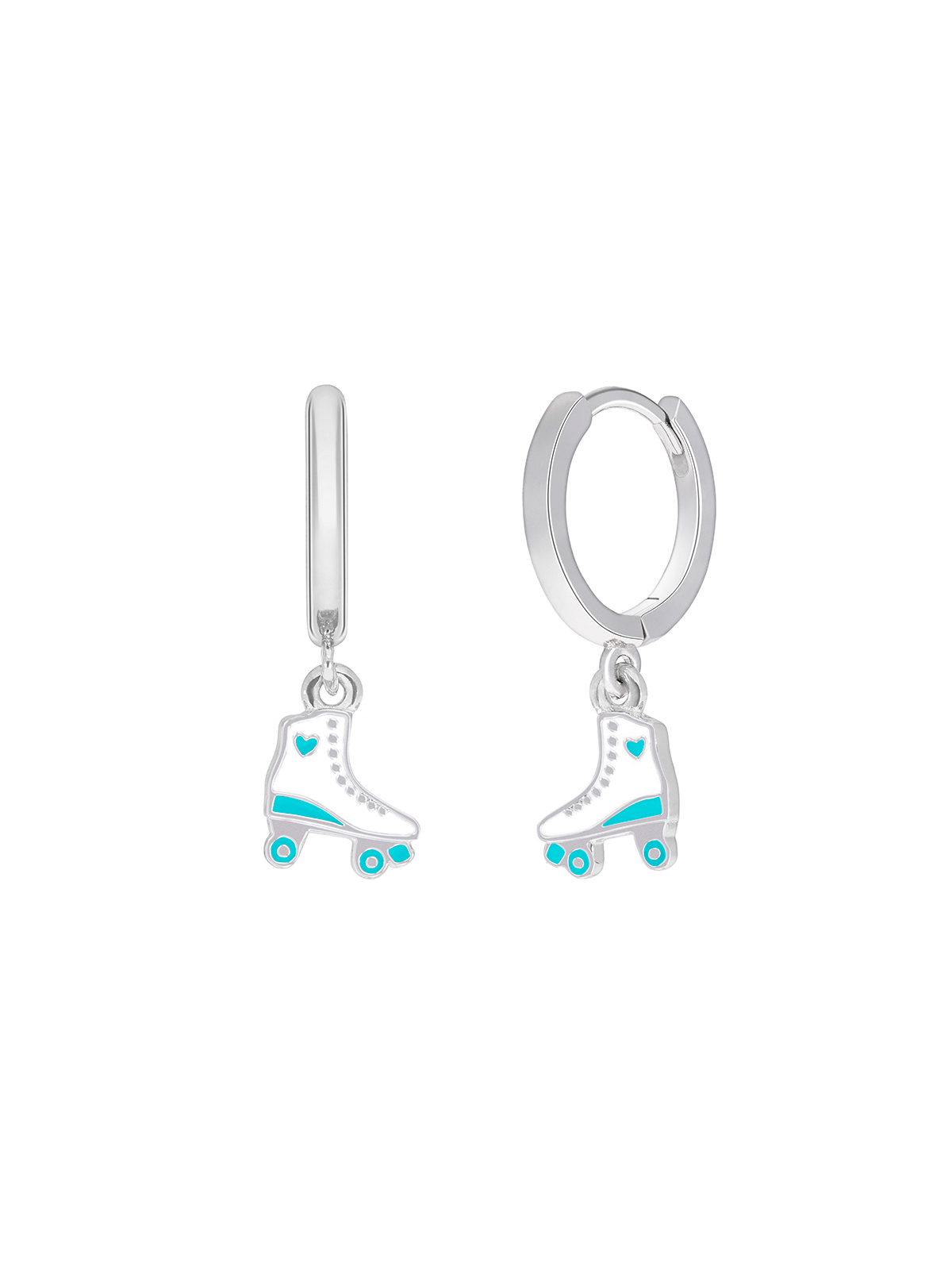 Pendiente hoop patines. Plata de 1ª Ley rodiada. Esmalte turquesa y blanco. Cierre huggy.