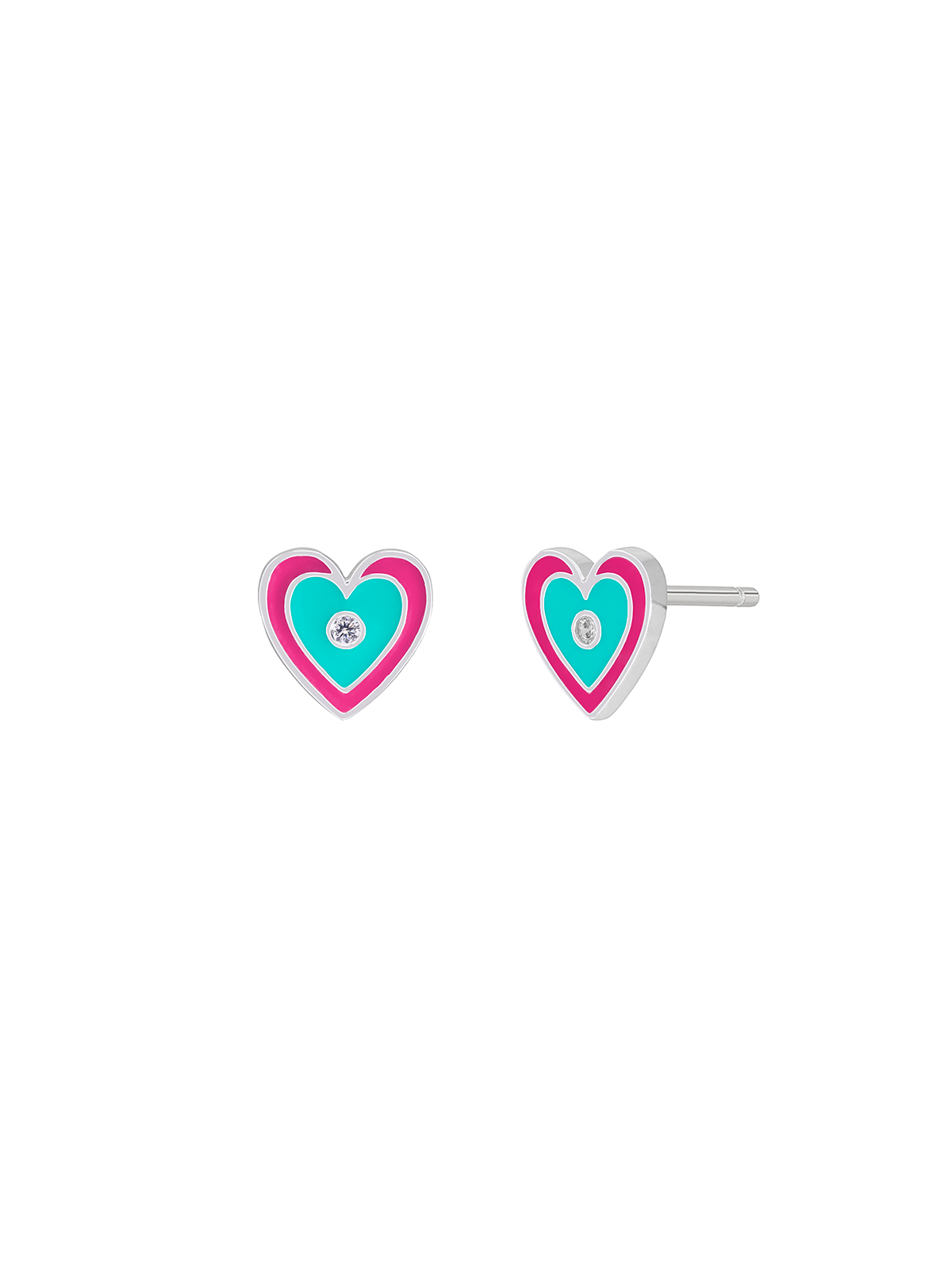 Pendiente corazón. Plata de 1ª Ley rodiada. Esmalte turquesa y fucsia. Ciconita. Cierre presión.