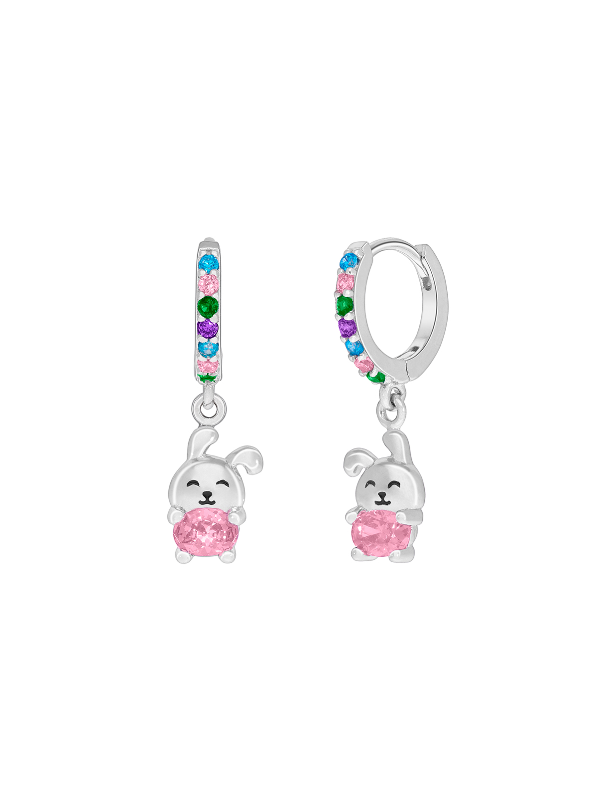 Pendiente hoop búho con circonita de color rosa. Cierre huggy con circonitas de color: rosa, lila, esmeralda y azul.