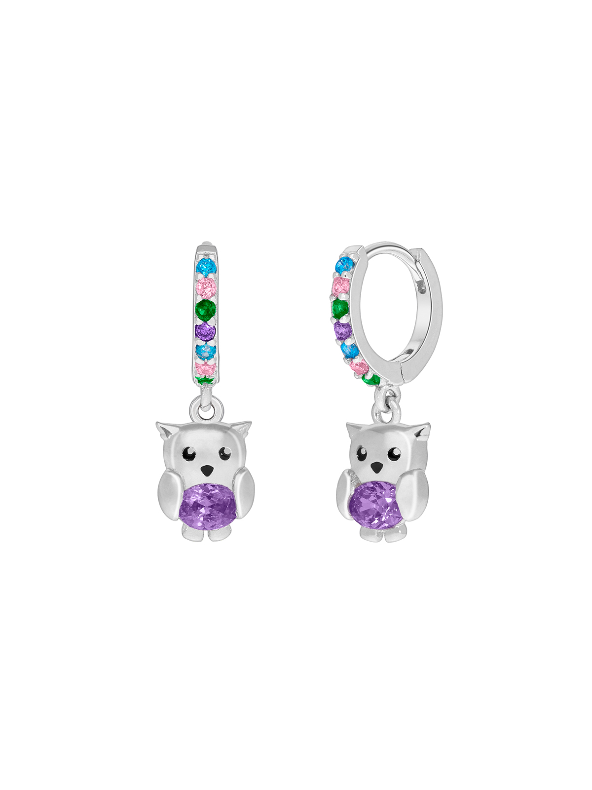 Pendiente hoop búho con circonita de color lila. Cierre huggy con circonitas de color: rosa, lila, esmeralda y azul.