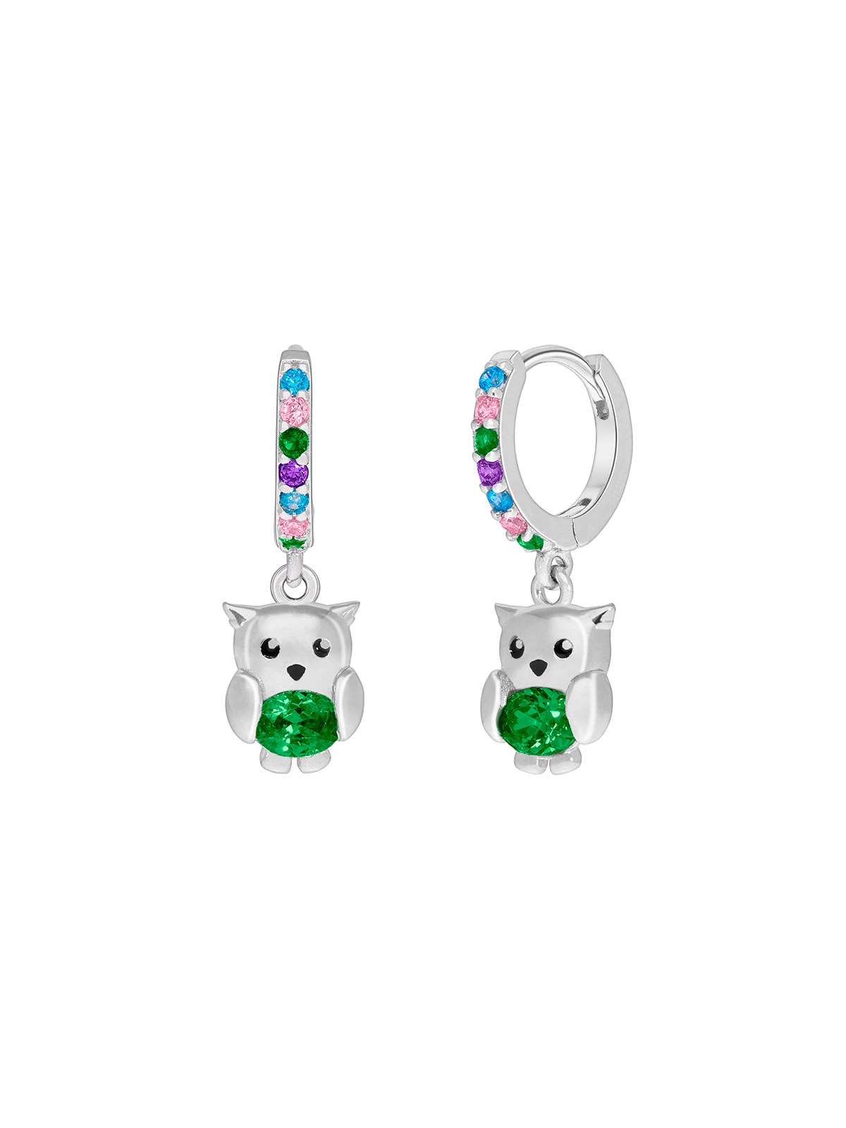 Pendiente hoop búho con circonita de color esmeralda. Cierre huggy con circonitas de color: rosa, lila, esmeralda y azul.
