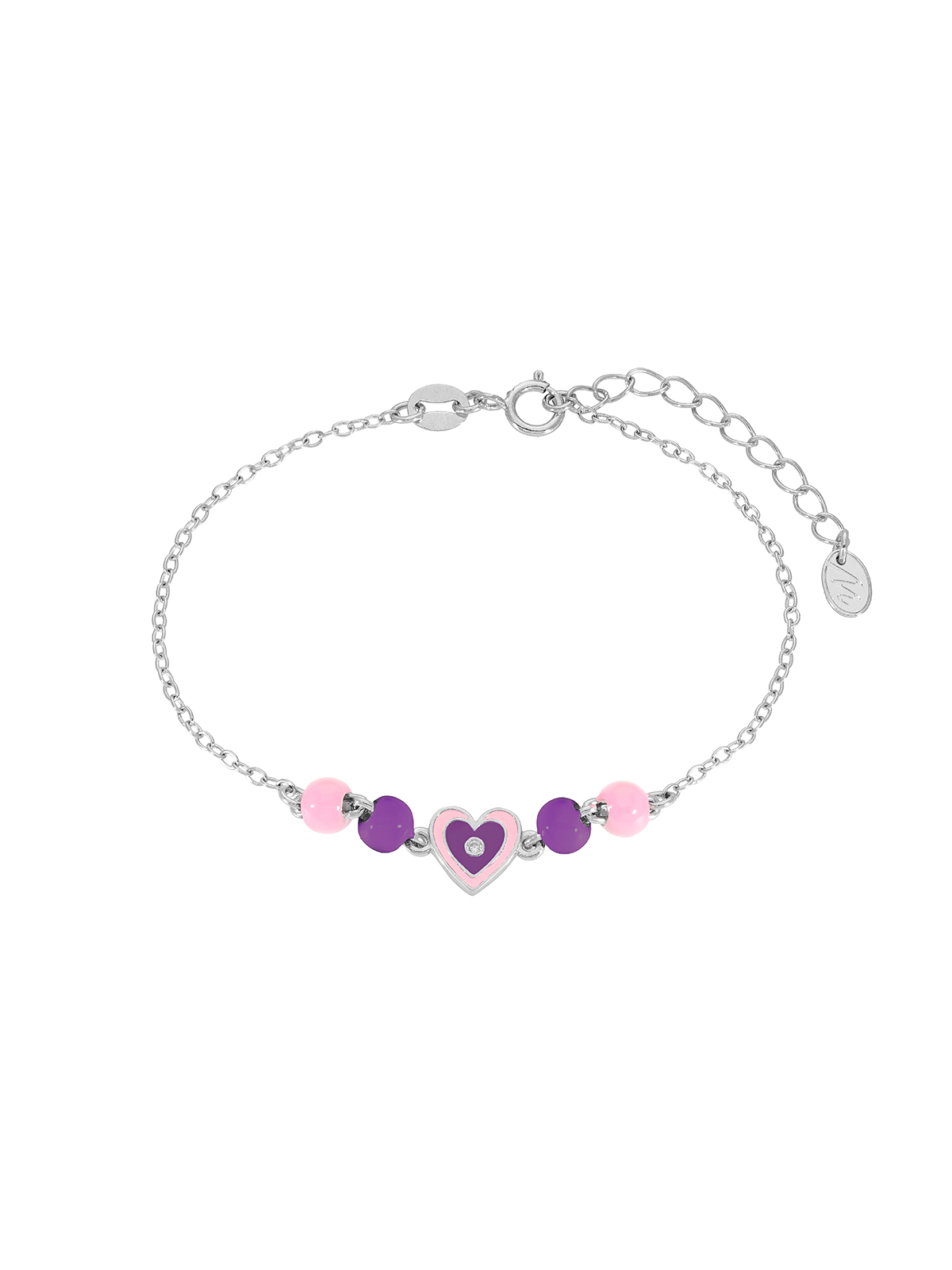 Pulsera corazón. Plata de 1ª Ley rodiada. Esmalte lila y rosa. Ciconita. Cierre reasa. Cadena adptable.