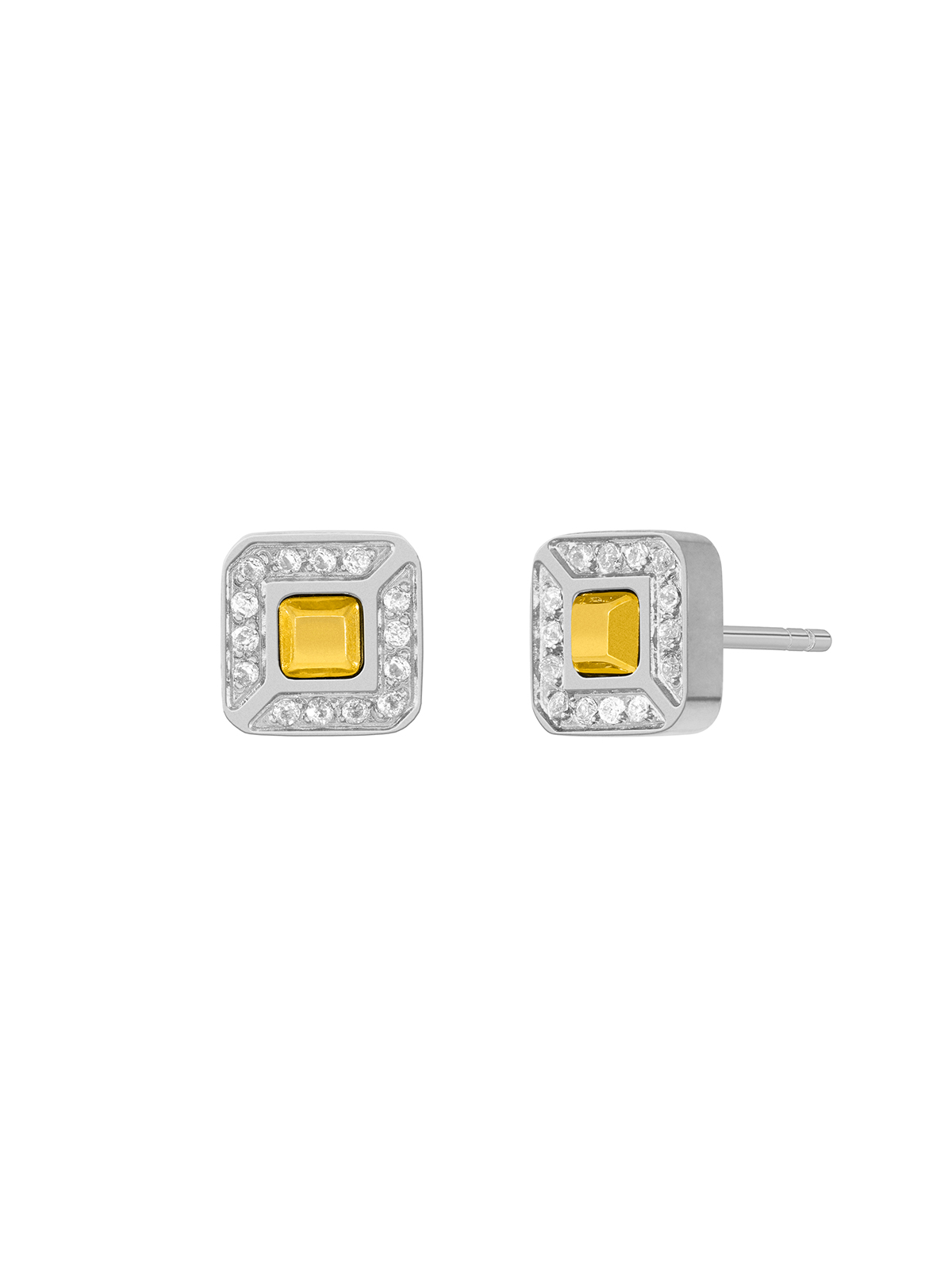Pendientes cuadrados. Versión en bicolor acero y dorado. Cierre presión.