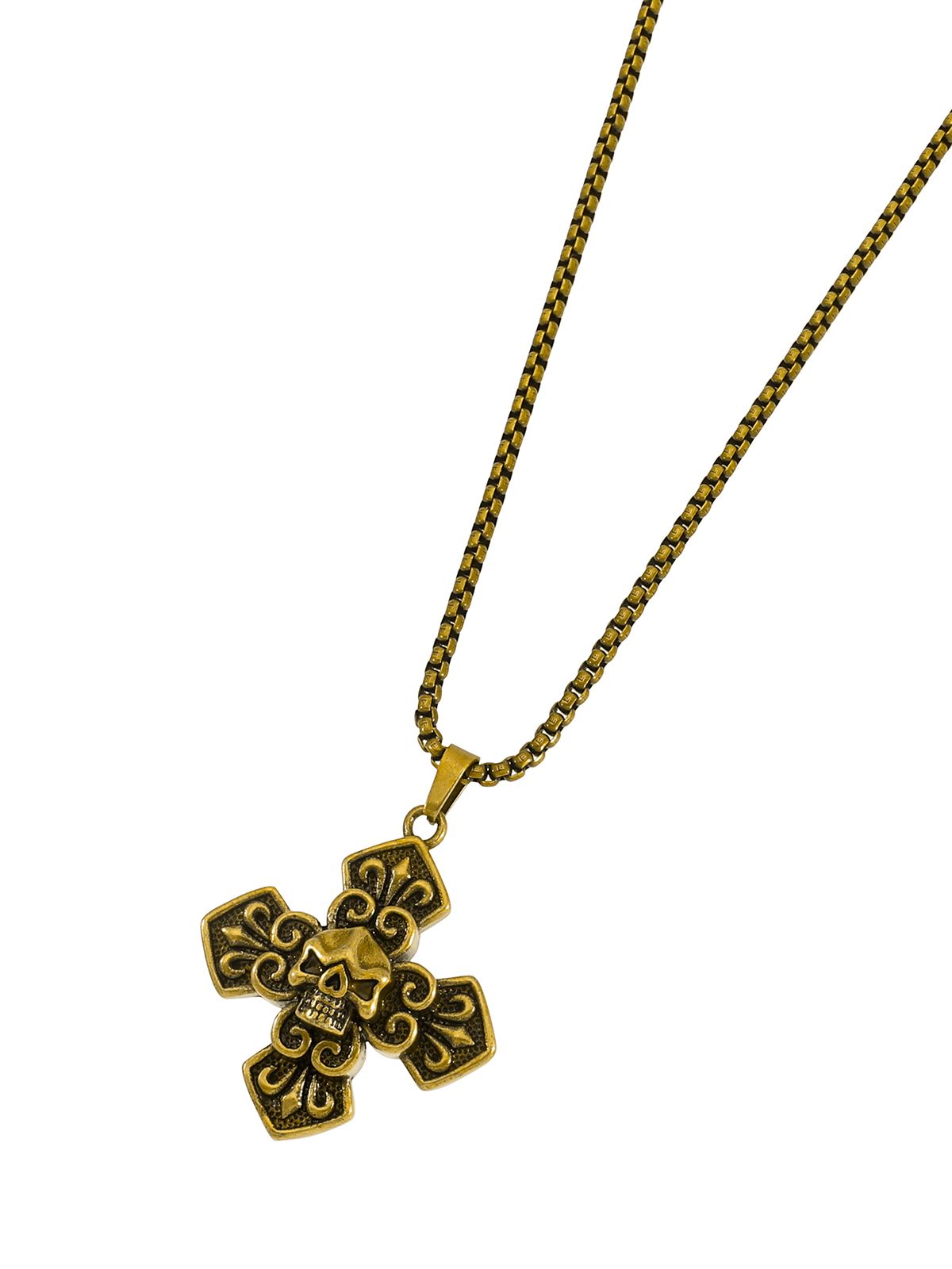 Collar de acero inoxidable versión en dorado. Cruz con calavera.