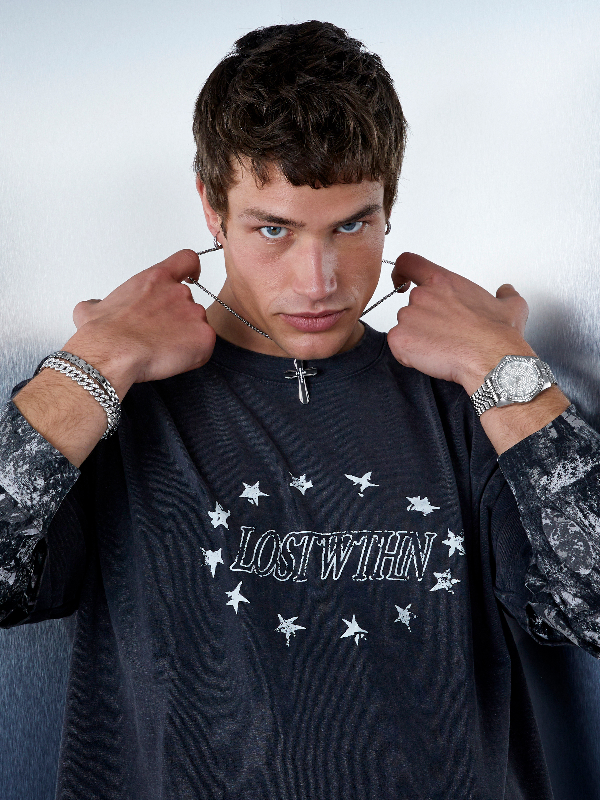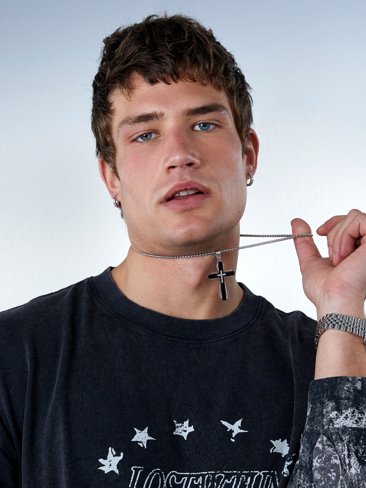 Collar cruz versión en acero con detalle en negro. Cruz con circonitas.