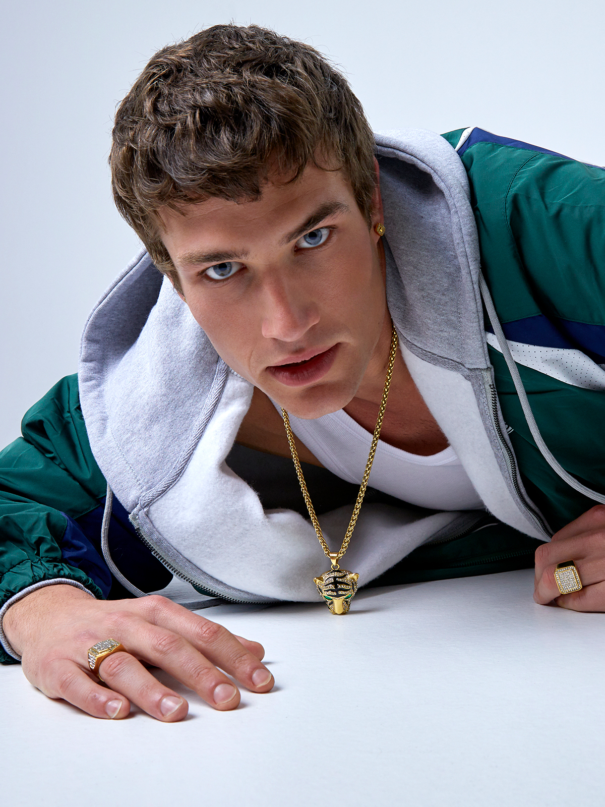 Collar cabeza de tigre versión en dorado con circonitas, circonitas verdes y esmalte negro.