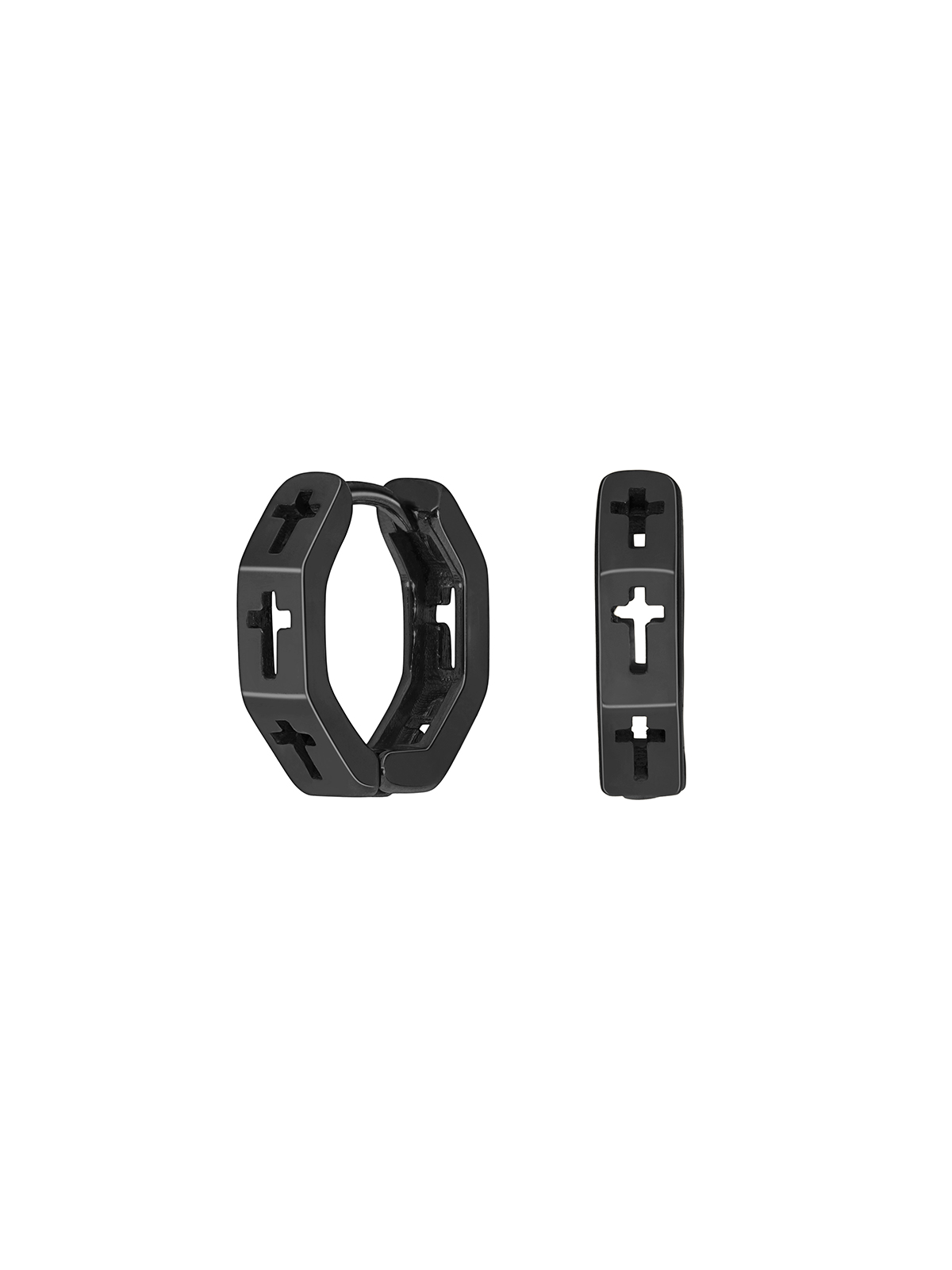 Pendientes de acero inoxidable versión en negro. Aros con cruces. Cierre huggy.