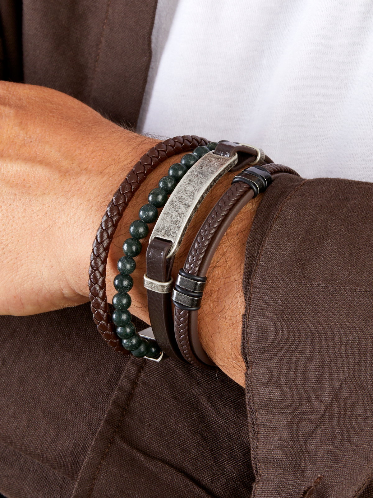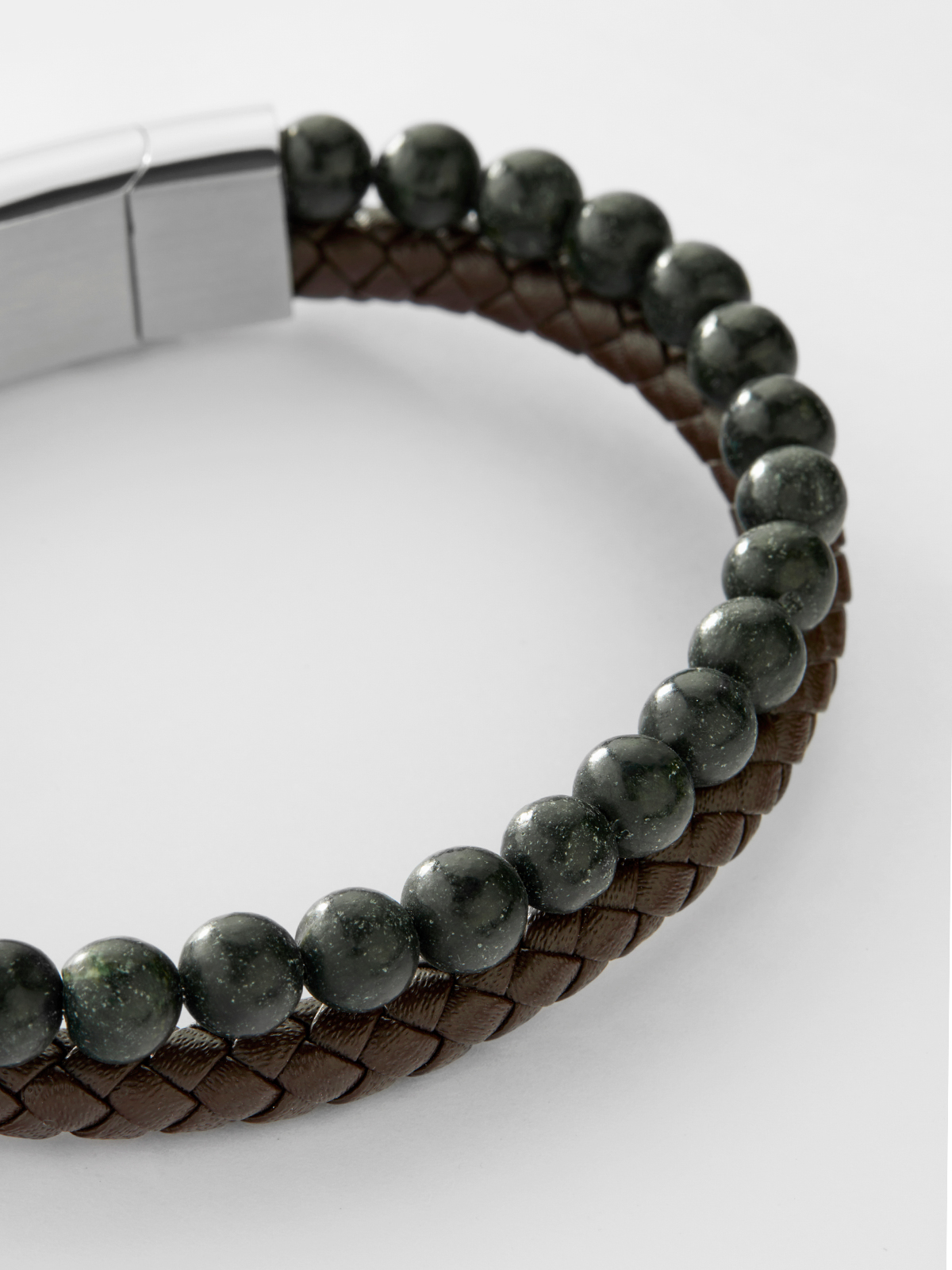Pulsera doble de piel y piedras con cierre ajustable. Material pulsera: Piel trenzada color marrón y piedras jaspeadas en tonos verdes. Material cierre: Acero. Longitud: 22 cm.