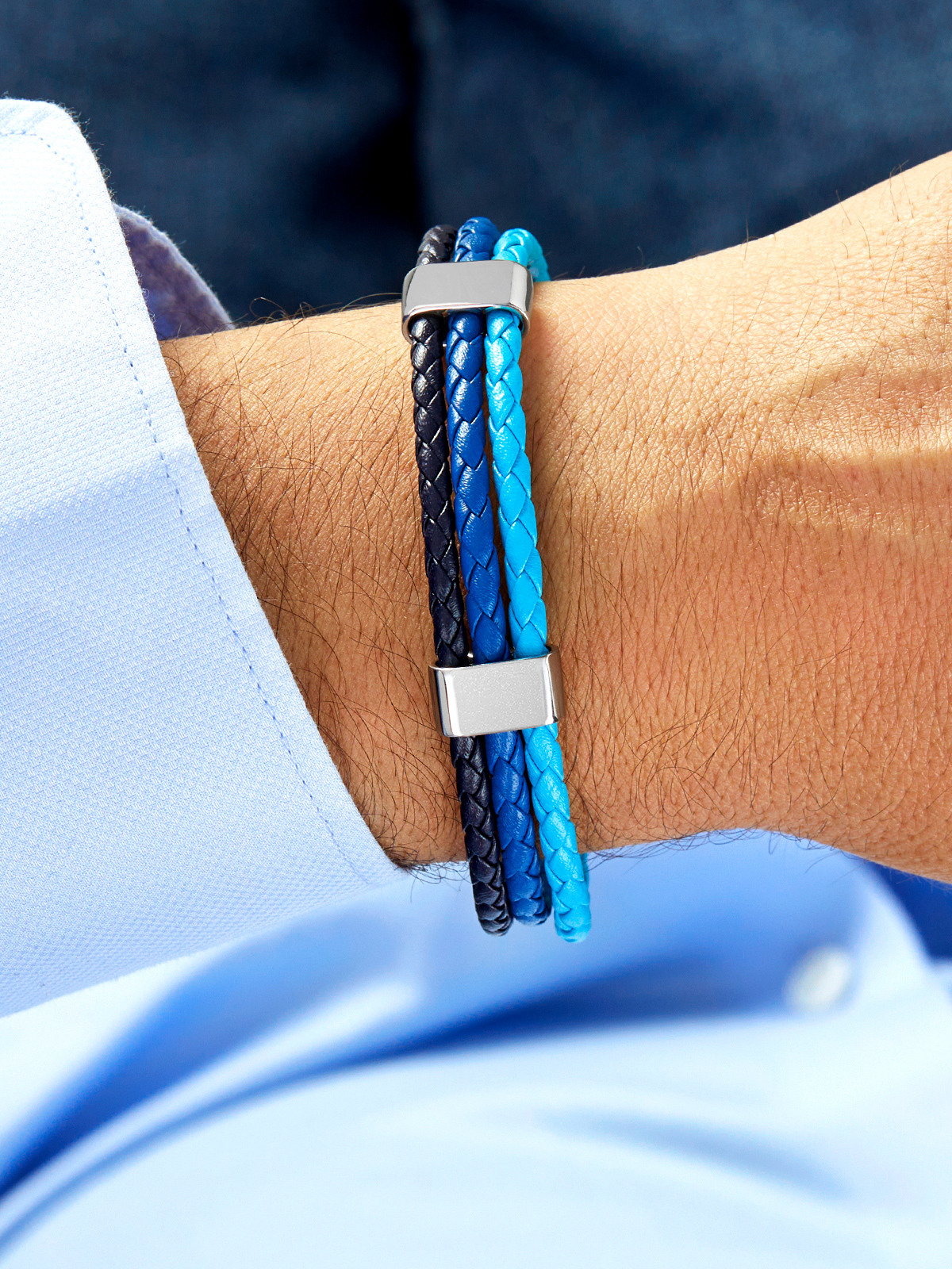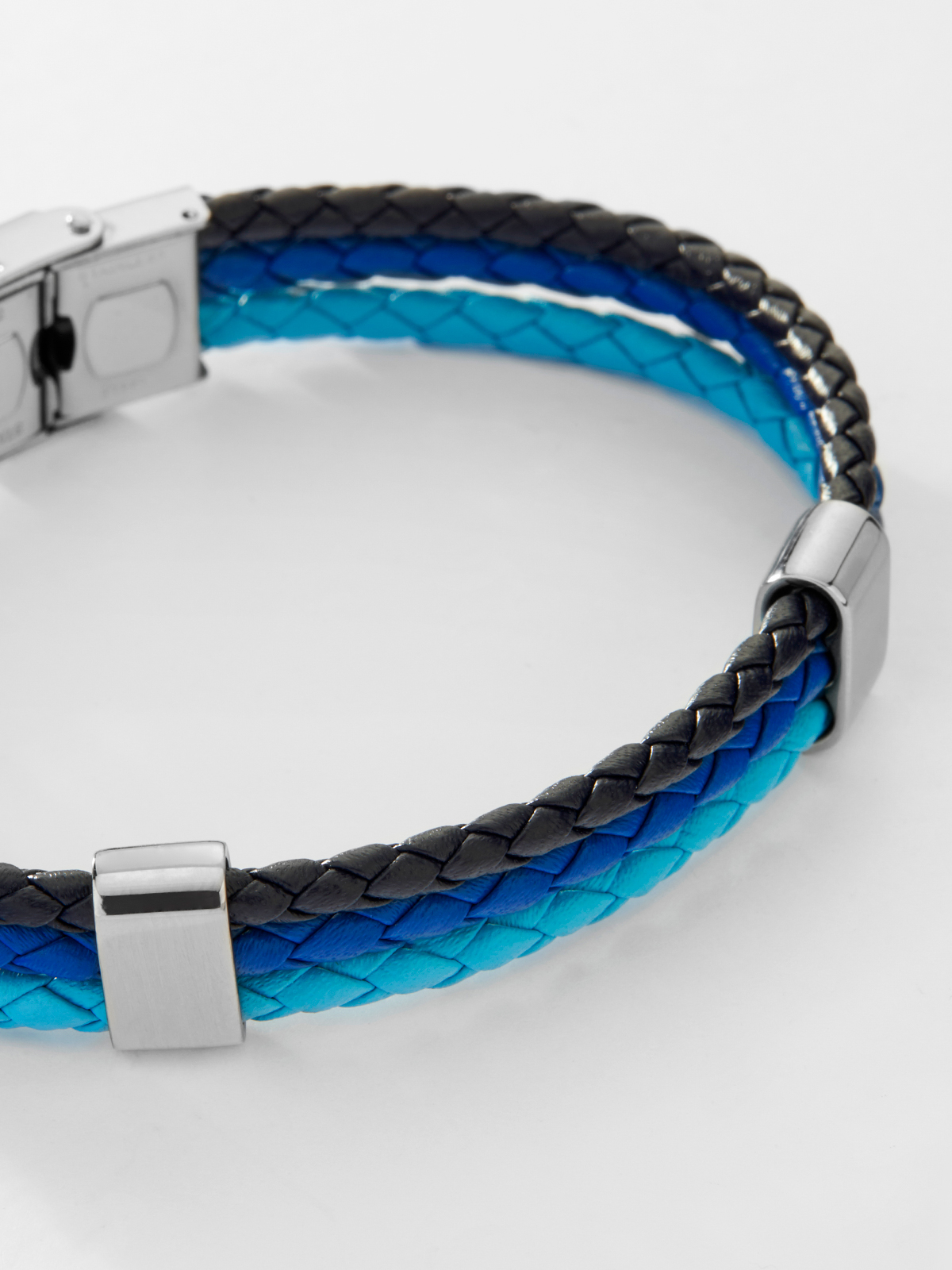 Material pulsera: Acero y piel en color azul eléctrico, azul oscuro y negro.