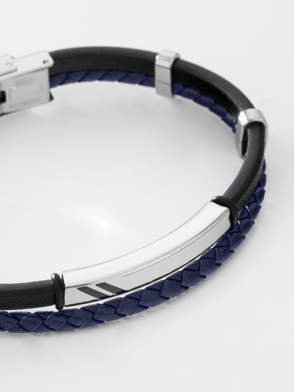 Pulsera de cuero plano negro/cuero trenzado azul con rayas negras y placa con líneas negras.