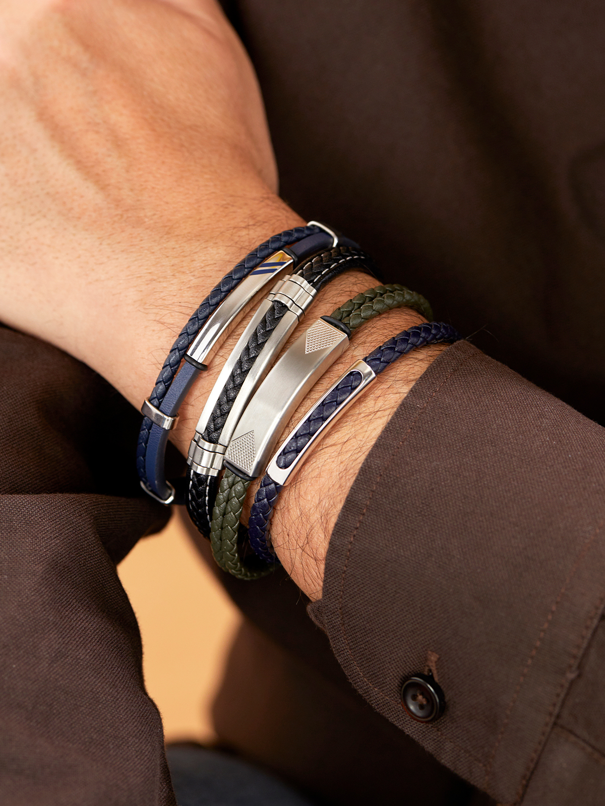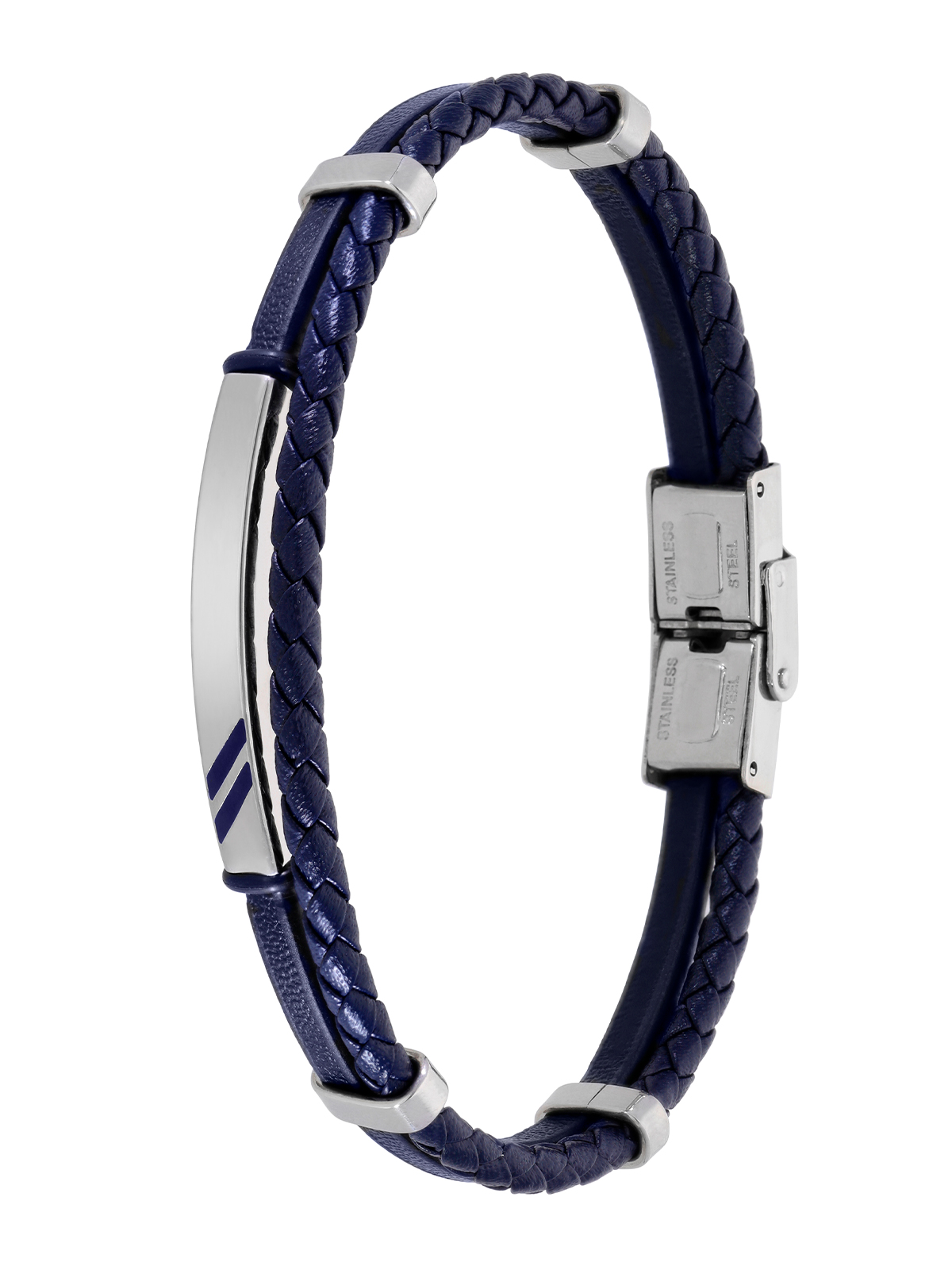 Pulsera de cuero plano azul oscuro/cuero trenzado azul con rayas azules.