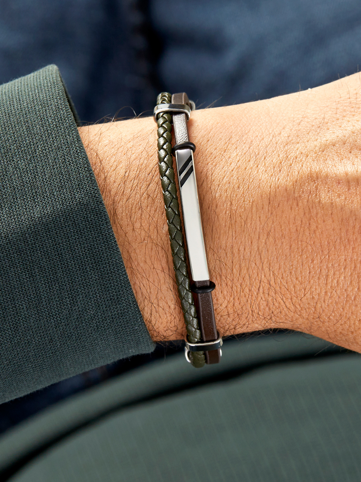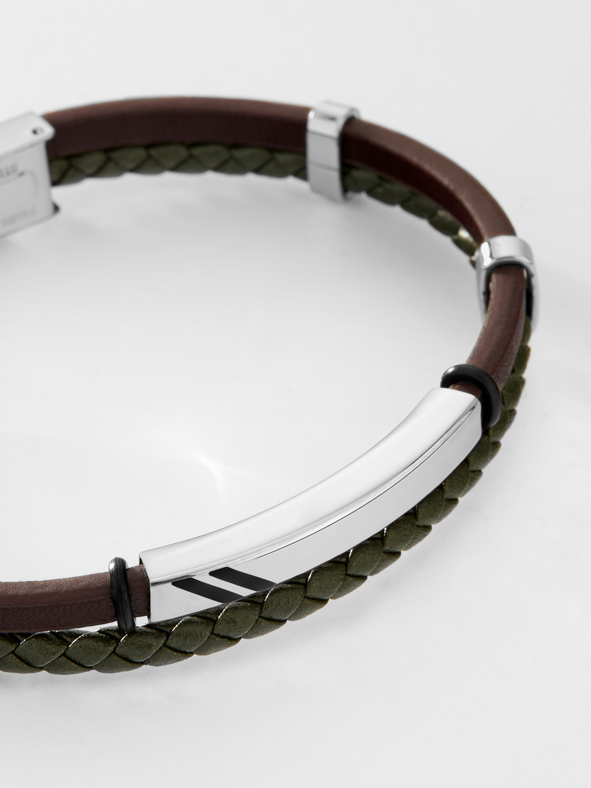 Pulsera de cuero plano marrón oscuro/cuero trenzado verde oscuro con rayas negras y placa con líneas negras.