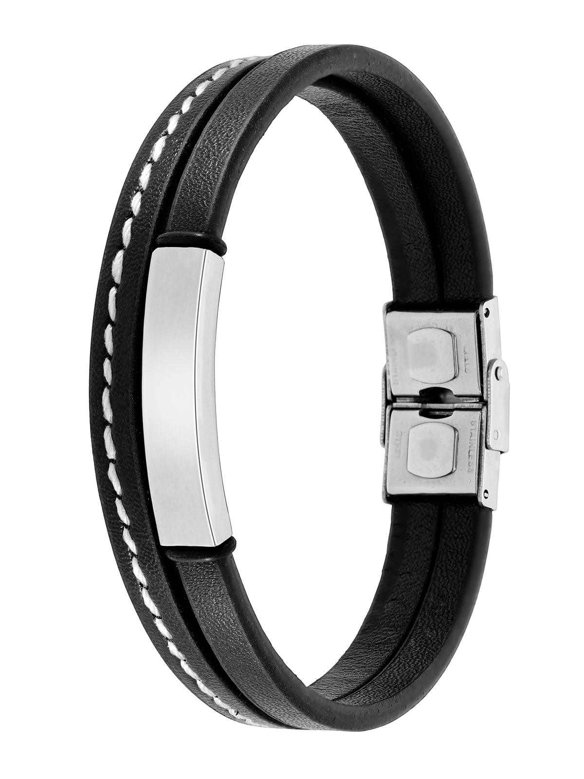 Pulsera de piel color negro con detalles hilo en color blanco. Placa grabable.