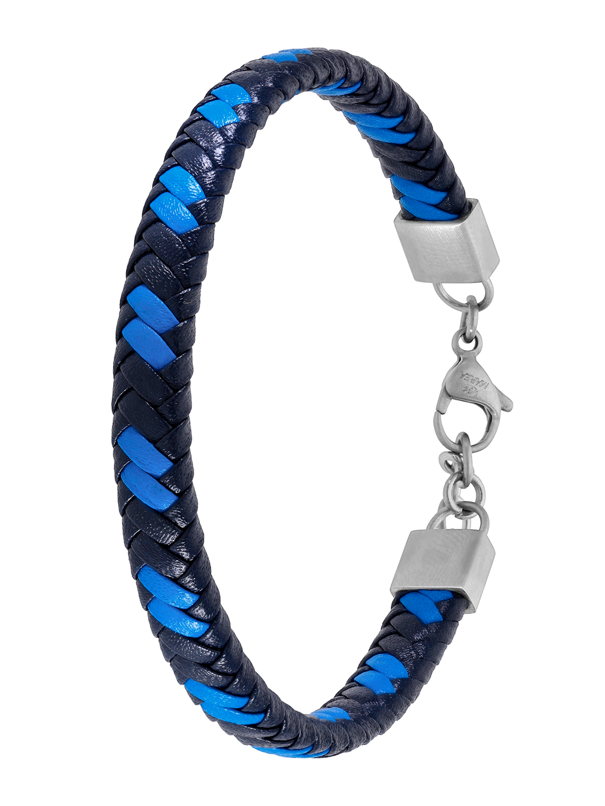 Pulsera de piel trenzada azul marino con toques de color en azul claro.