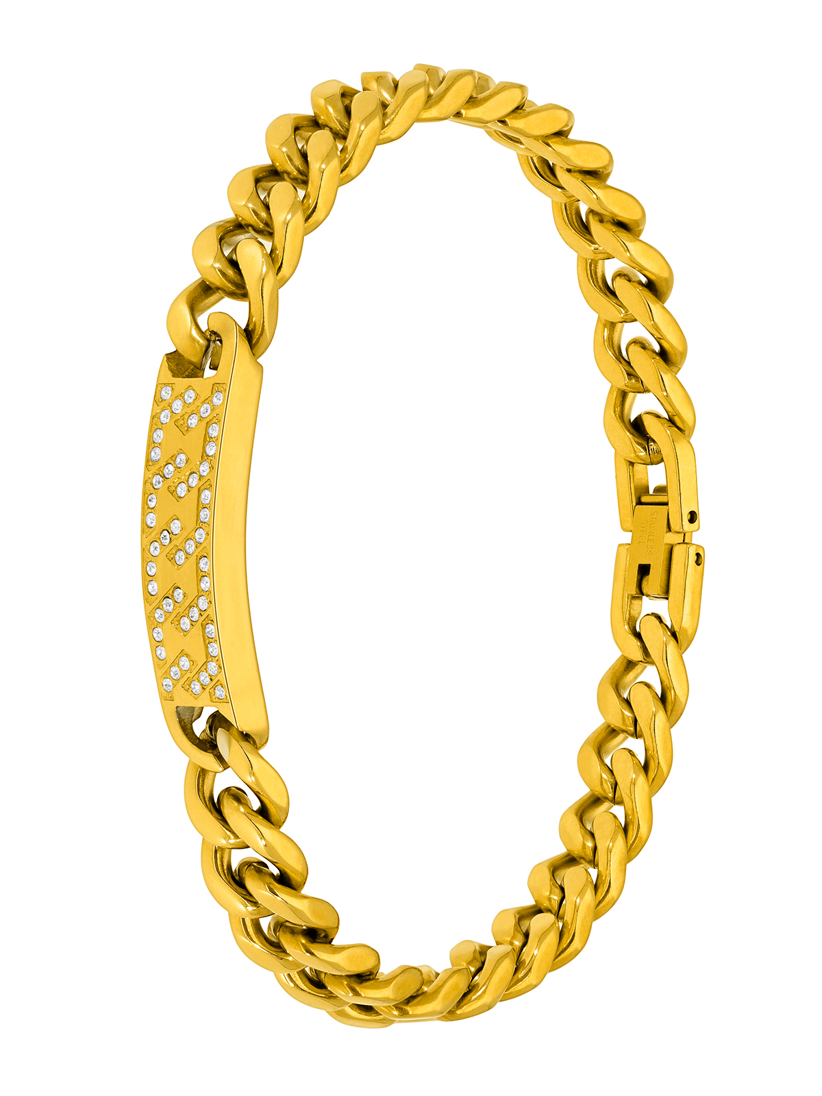 Pulsera de cadena eslabones versión en dorado. Placa con dibujo eslabones con circonitas.