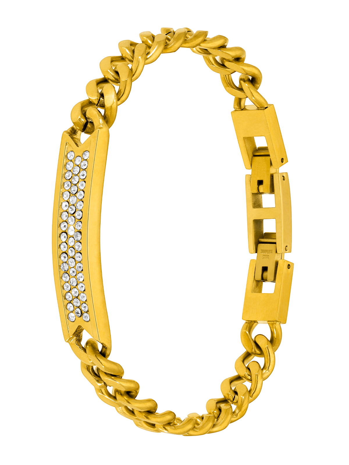 Pulsera de cadena eslabones versión en dorado. Placa con circonitas.
