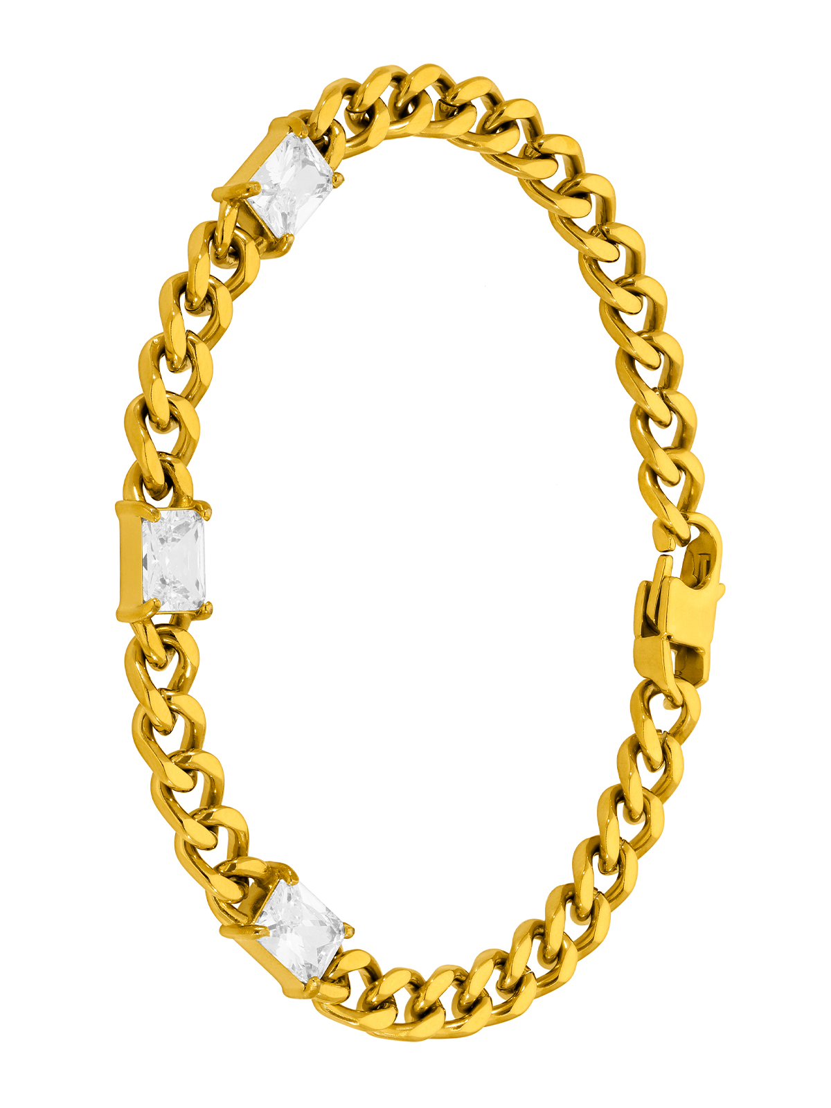 Pulsera eslabones circonitas rectangular. Versión en dorado.