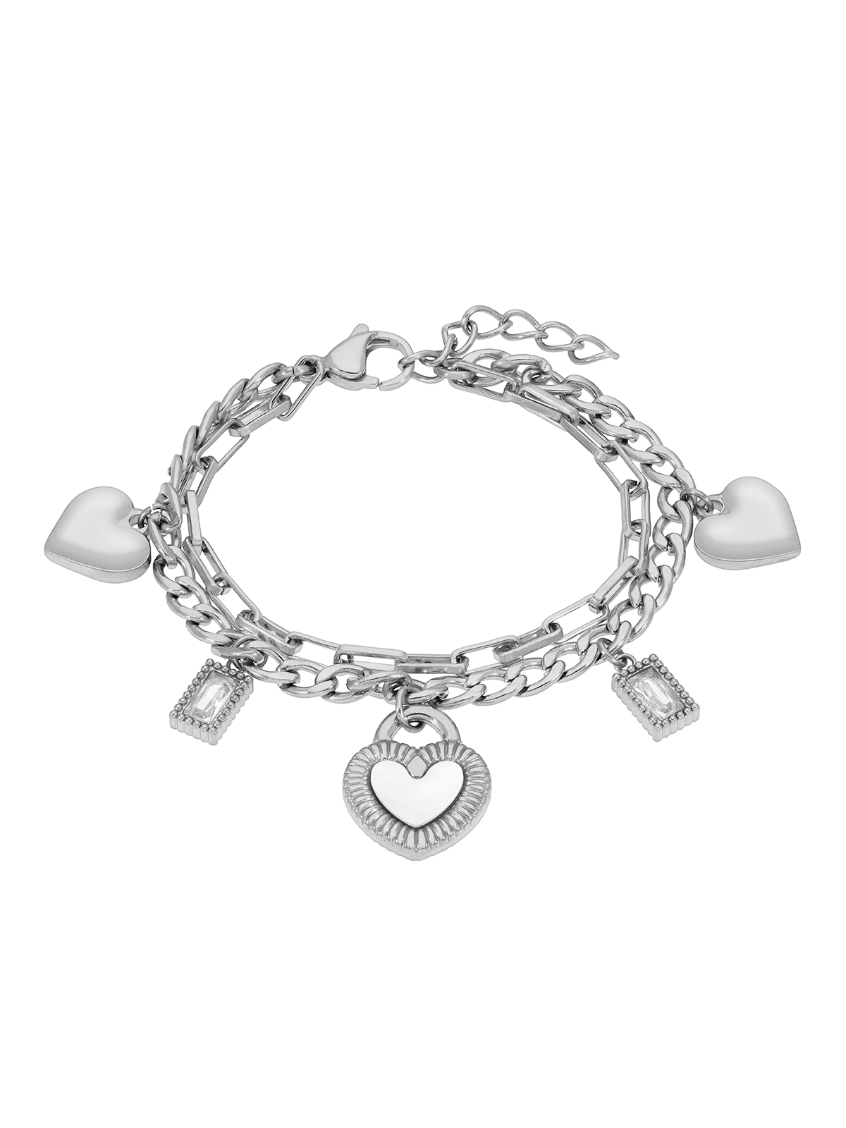 Pulsera doble eslabones corazón nácar. Circonitas en bocel. Versión en acero. Cierre mosquetón. Cadena adaptable.