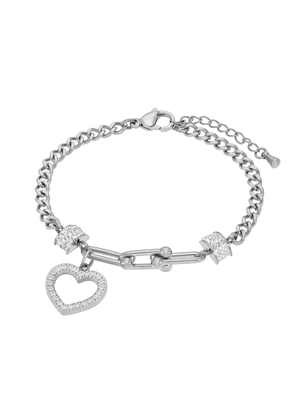 Pulsera eslabones corazón. Circonitas en microengaste. Versión en acero. Cierre mosquetón. Cadena adaptable.