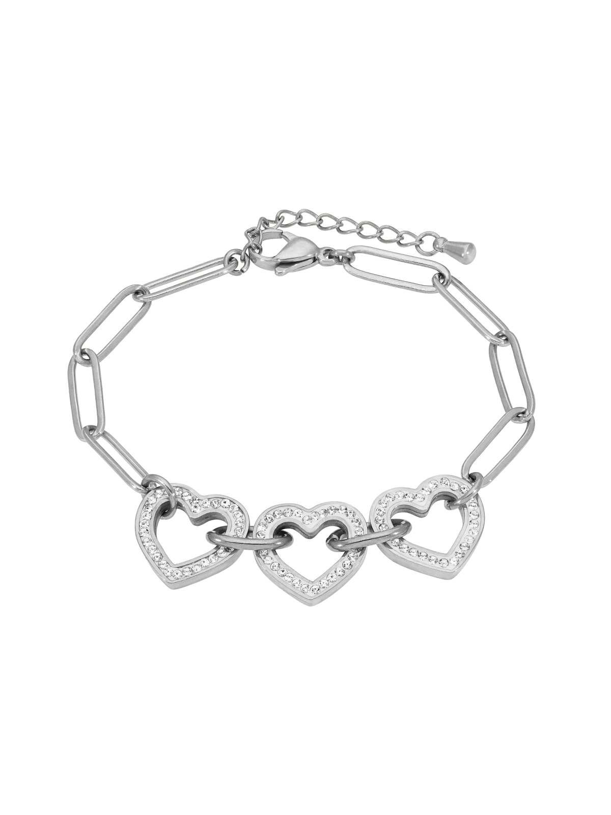Pulsera eslabones corazones. Circonitas en microengaste. Versión en acero. Cierre mosquetón. Cadena adaptable.