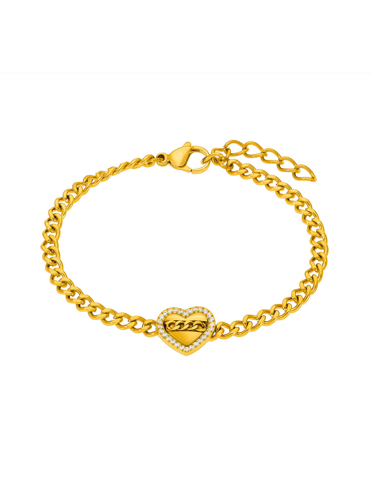 Pulsera corazón. Cadena de eslabones. Versión en dorado. Cierre mosquetón, Cadena adaptable.