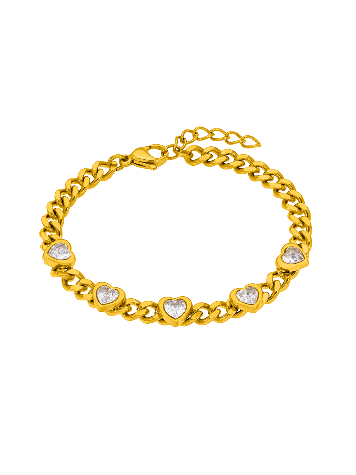 Pulsera eslabones corazones. Circonitas en forma corazón. Versión en dorado. Cierre mosquetón. Cadena adaptable.