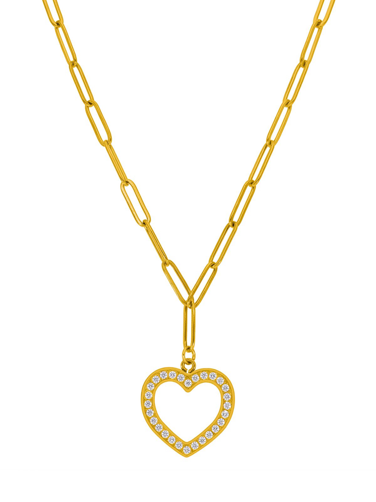 Collar eslabones corazón. Circonitas en microengaste. Versión en dorado. Cierre mosquetón. Cadena adaptable.