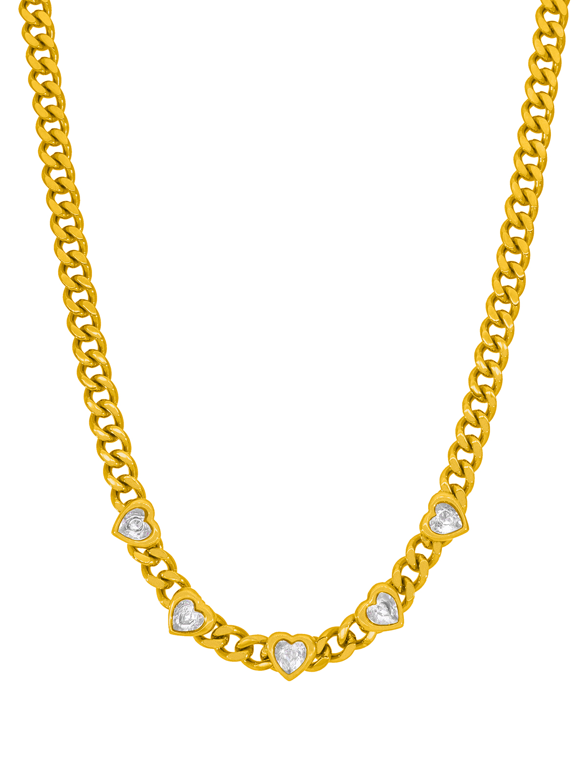 Collar eslabones corazones. Circonitas en forma corazón. Versión en dorado. Cierre mosquetón. Cadena adaptable.
