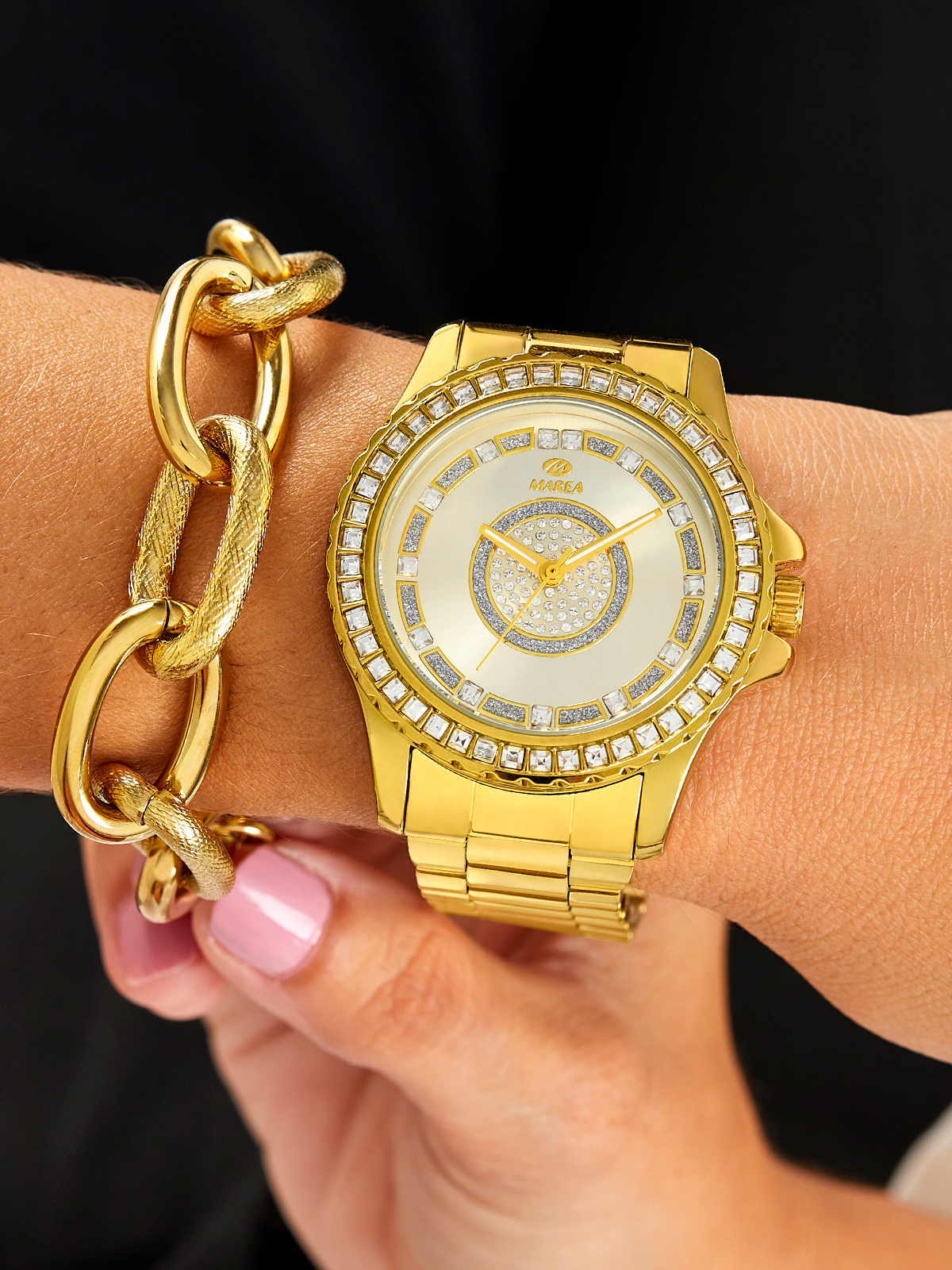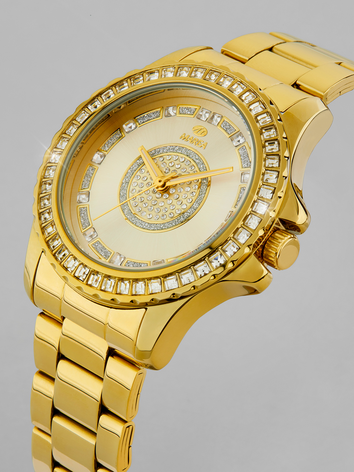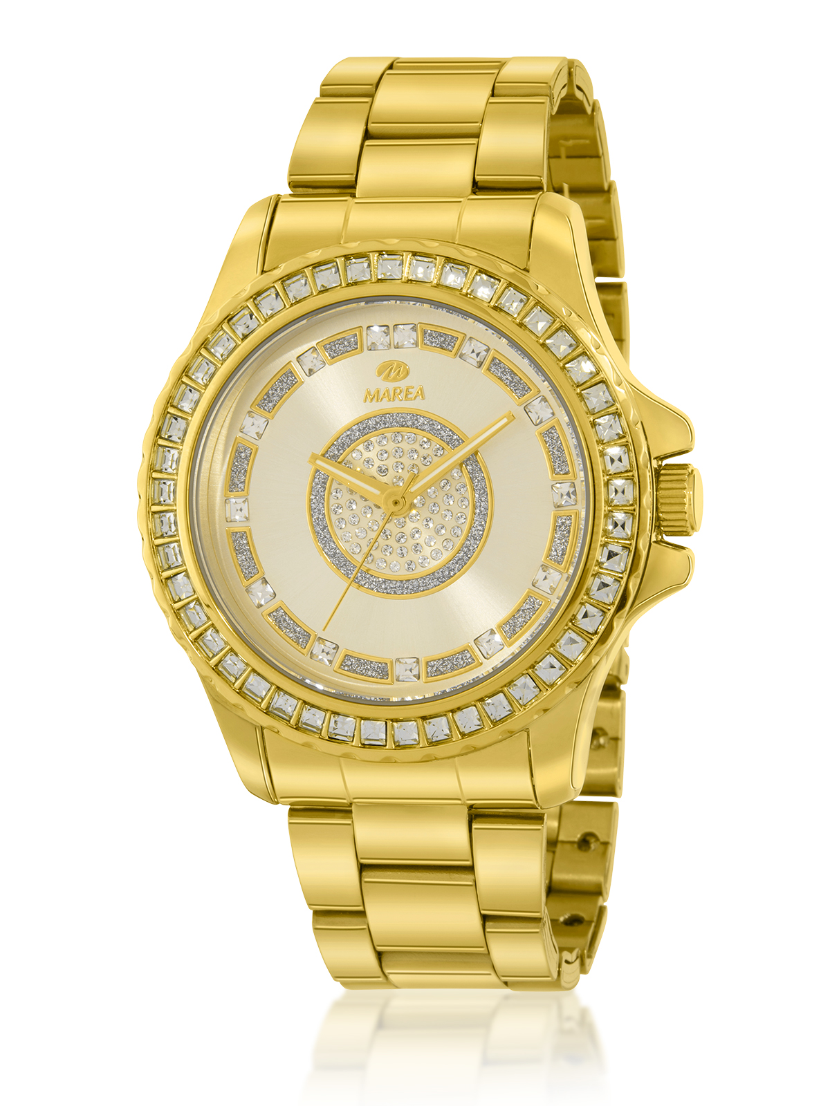 Movimiento japonés: 3 agujas. Bisel y índices con circonitas blancas. Acabado dorado. Diámetro Caja: 46 mm. Material Caja: Metal. Material Brazalete: Acero/Steel. Resistente al agua: 5ATM.