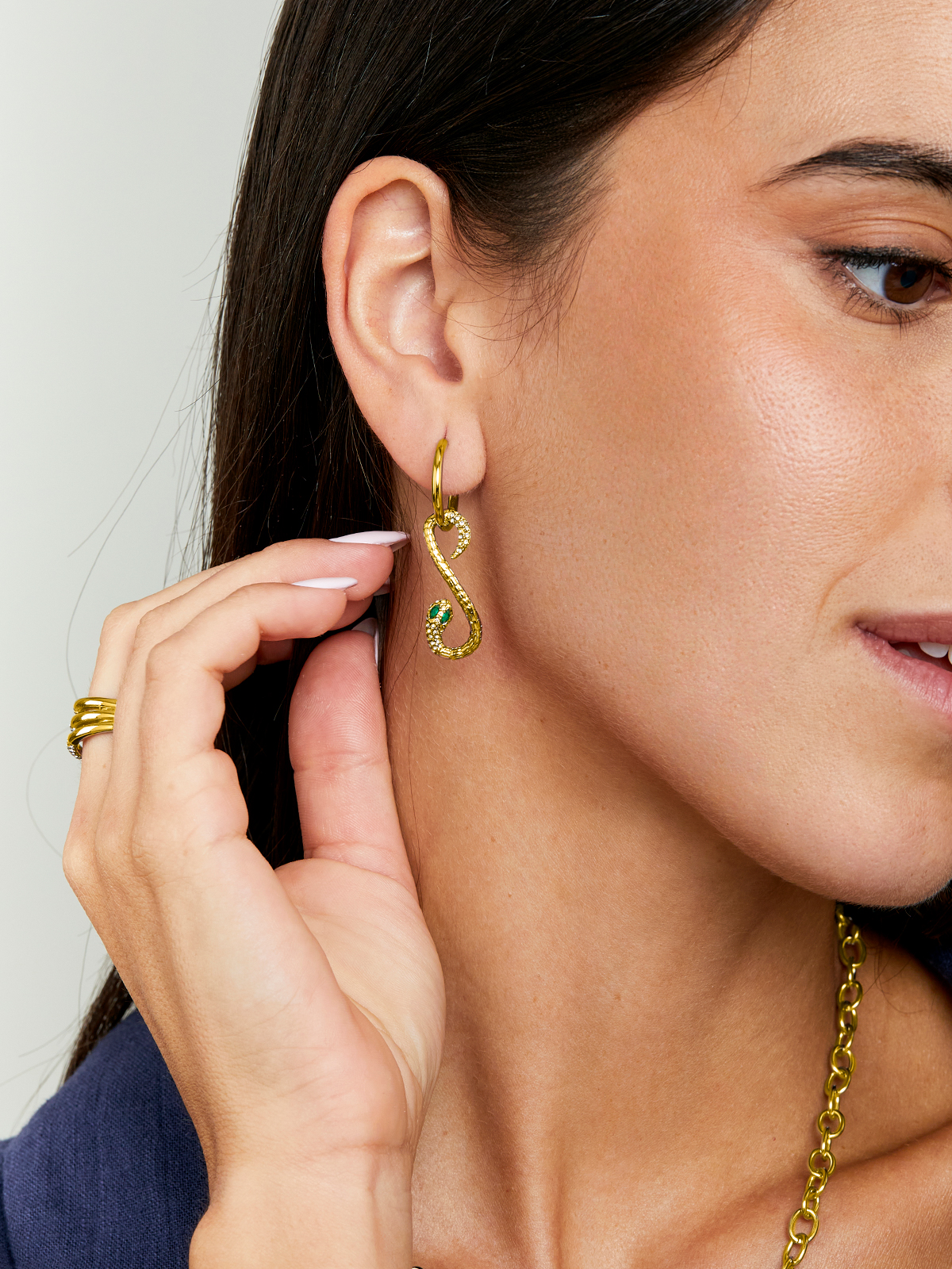 Pendientes aro snake. Circonitas en color blanca y verde. Versión en dorado. Cierre huggy.