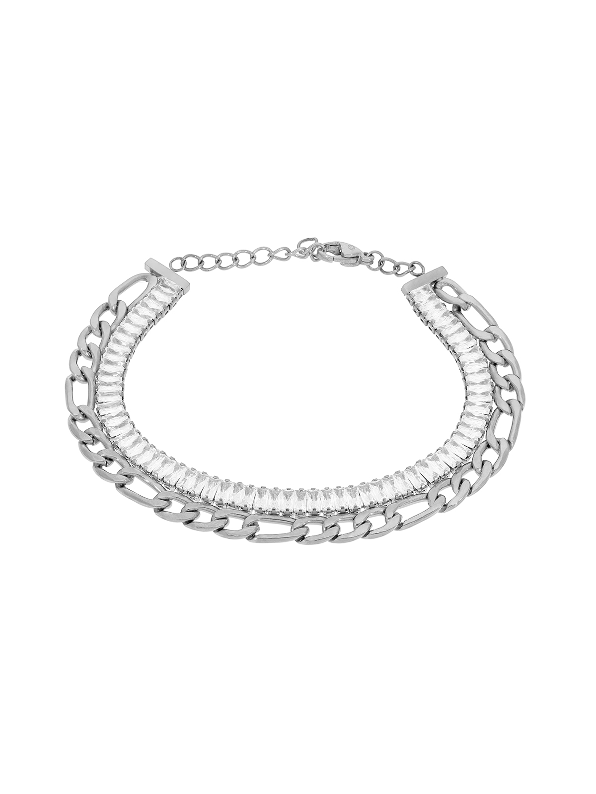 Pulsera eslabones doble combinada con circonitas baguet. Versión en acero. Cierre mosquetón. Cadena adaptable.