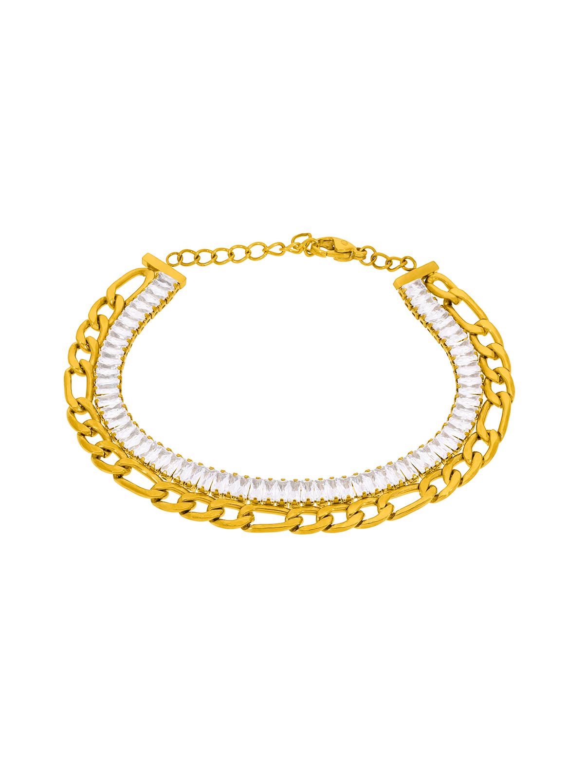 Pulsera eslabones doble combinada con circonitas baguet. Versión en dorado. Cierre mosquetón. Cadena adaptable.