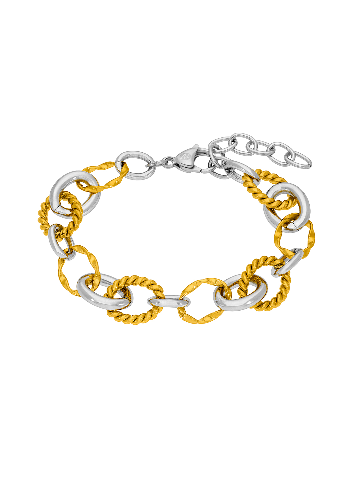 Pulsera cadena eslabón bicolor acero y dorado. Eslabón con textura. Cierre mosquetón. Cadena adaptable.