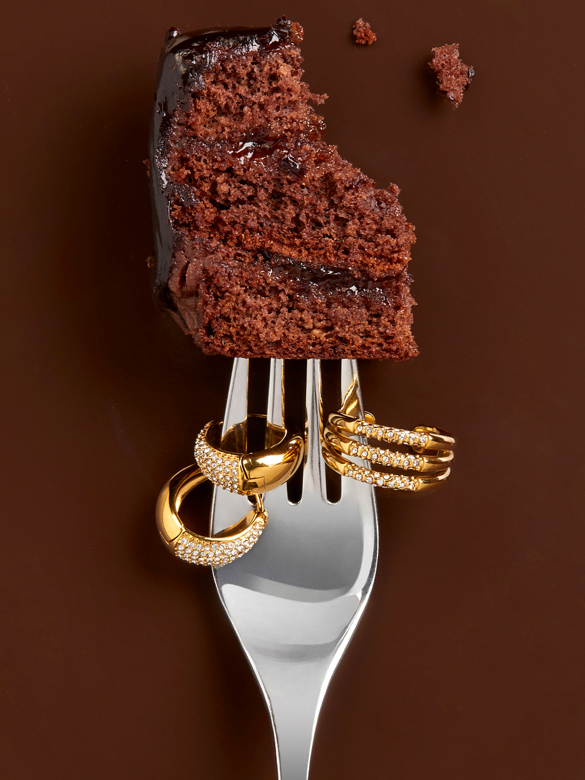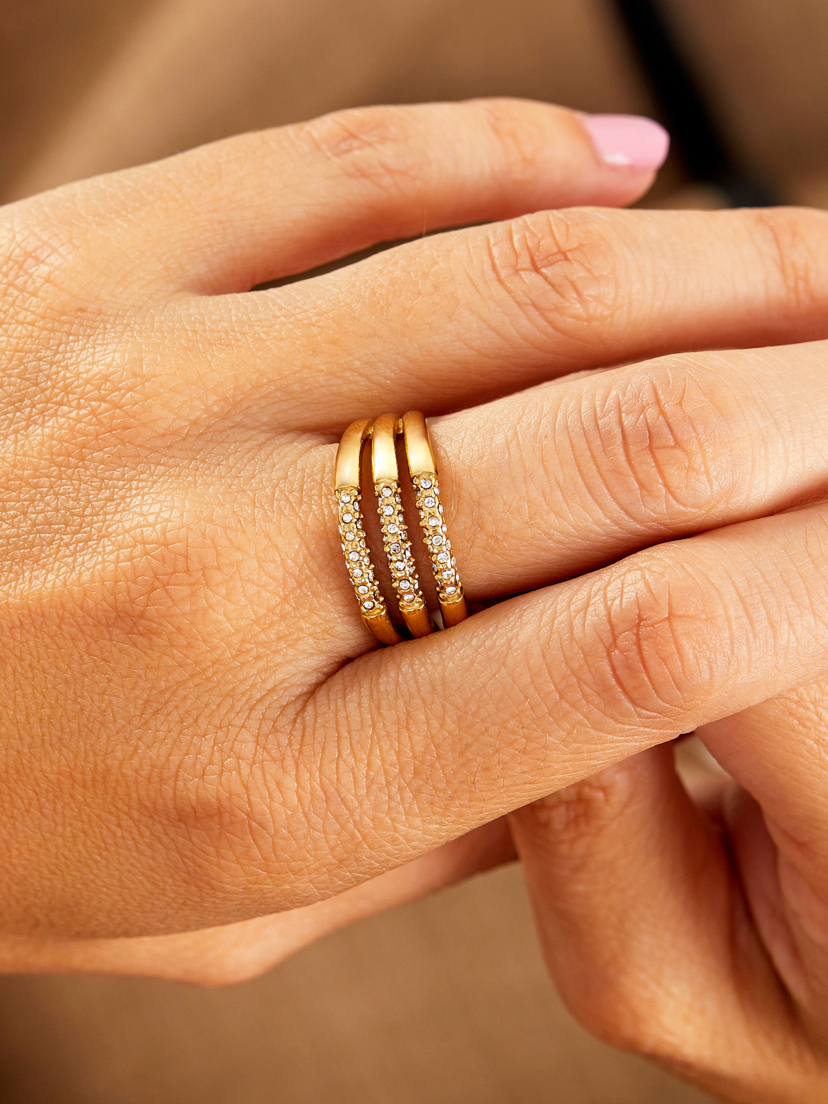 Anillo triple abierto con circonitas. Versión en dorado.