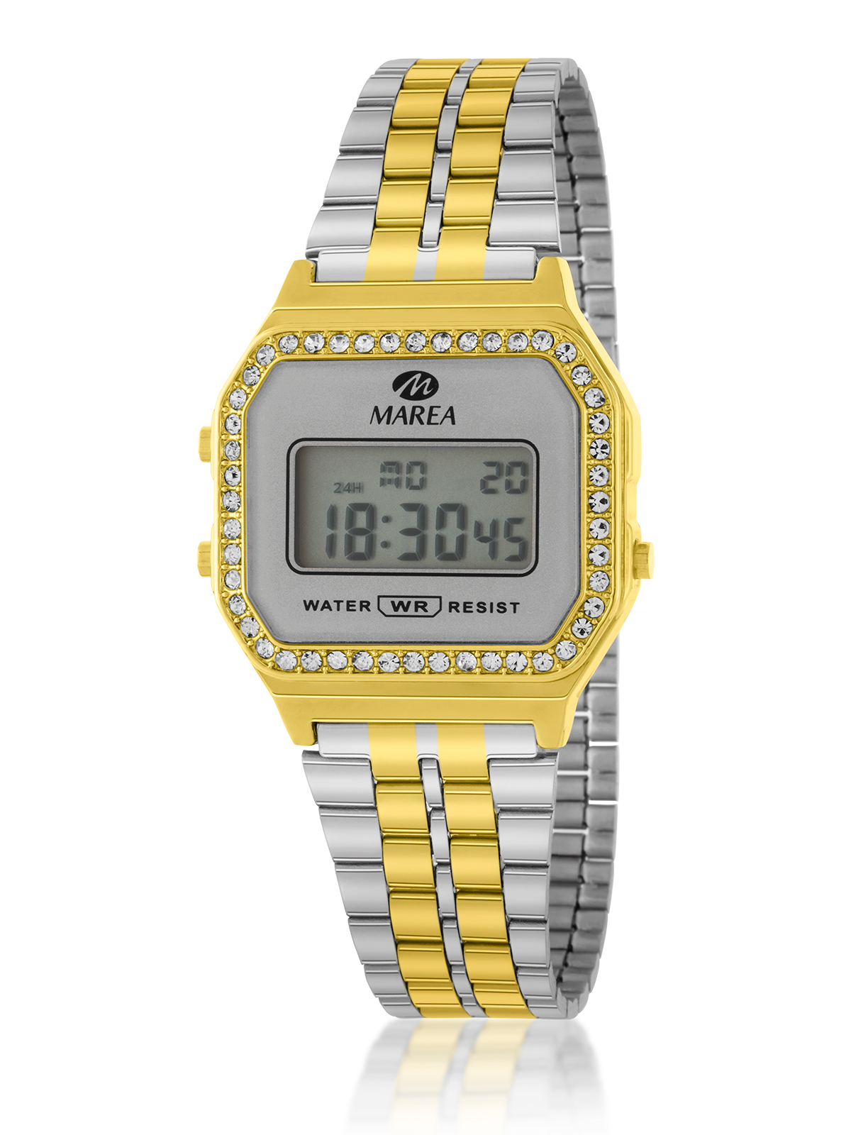Reloj digital pantalla LCD. Bisel y esfera con circonitas blancas. Diámetro Caja: 33x37mm. Material Caja: Metal. Material Brazalete: Acero/Steel. Resistente al agua: 3ATM.