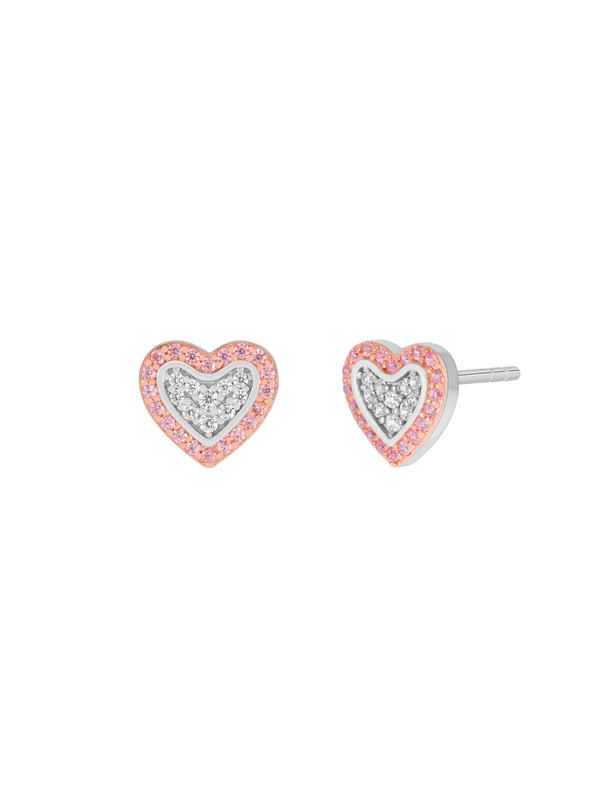 Pendientes corazón circonitas color rosa. Plata de 1ª Ley rodiada y baño de oro rosa 18k. Circonitas en microengaste. Cierre presión.