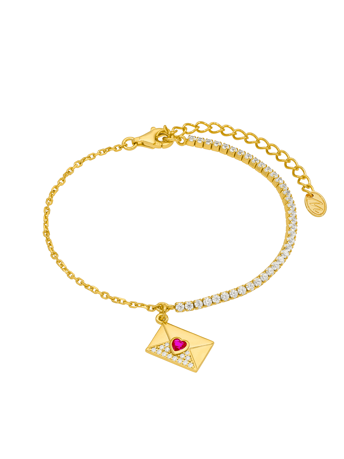 Pulsera sobre corazón. Plata de 1ª Ley baño en oro de 18k. Circonitas en microengaste y circonita en forma de corazón rubí. Cadena combianada tenis y eslabones. Cierre mosquetón. Cadena adaptable.