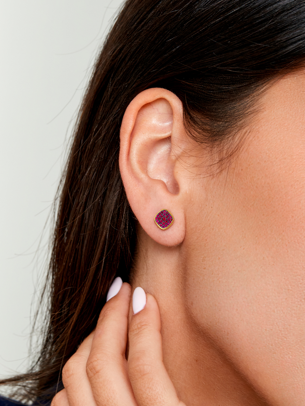 Pendientes punto de luz. Plata de 1ª Ley baño en oro de 18k. Circonitas en microengaste color granate. Cierre presión.