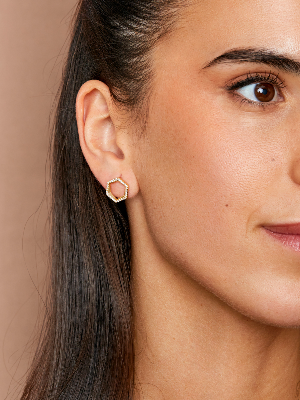Pendientes hexagonal. Plata de 1ª Ley baño en oro de 18k. Circonitas en microengaste. Cierre presión.