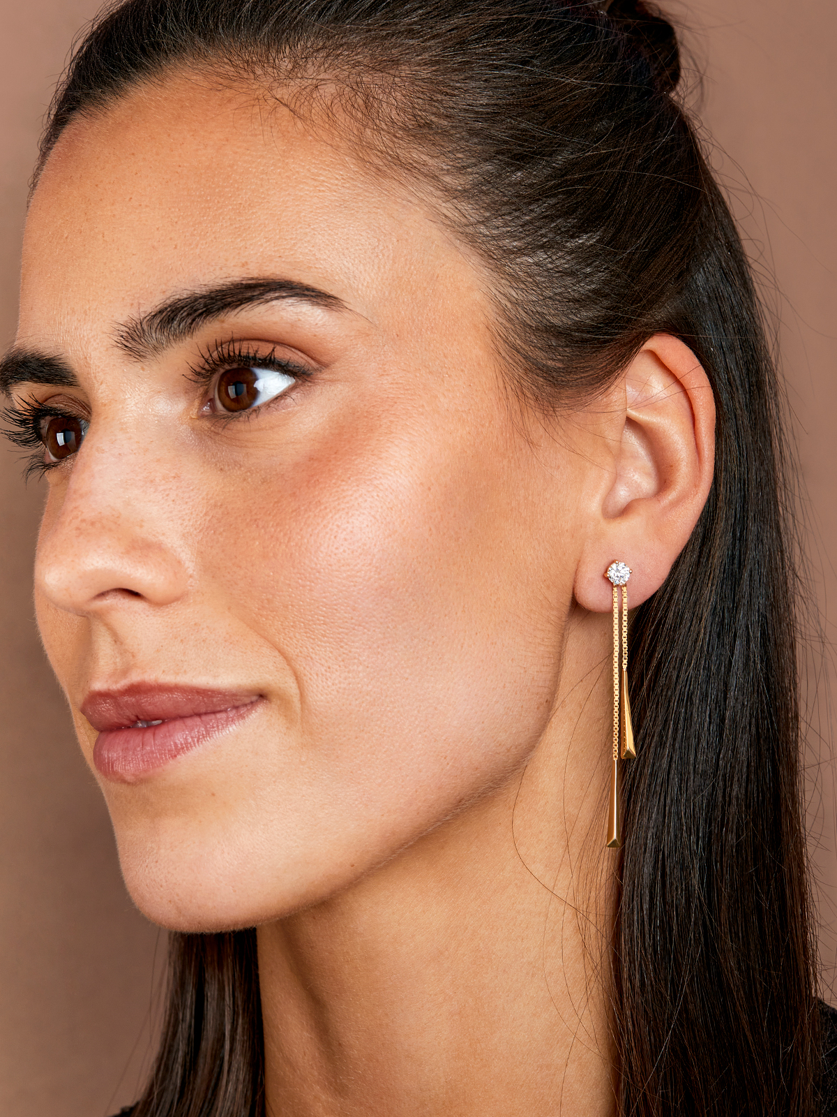 Pendiente largo cadena veneciana. Plata de 1ª Ley baño en oro de 18k. Circonita en garra. Cierre presión.
