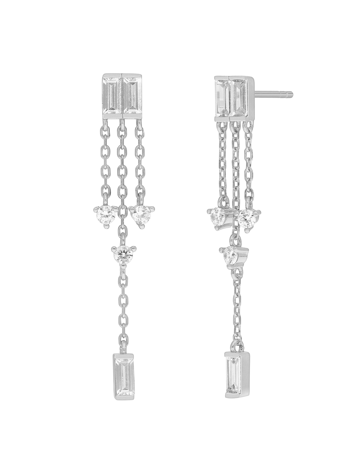 Pendientes circonitas baguette triple cadena. Plata de 1ª Ley rodiada. Circonitas. Cierre presión.