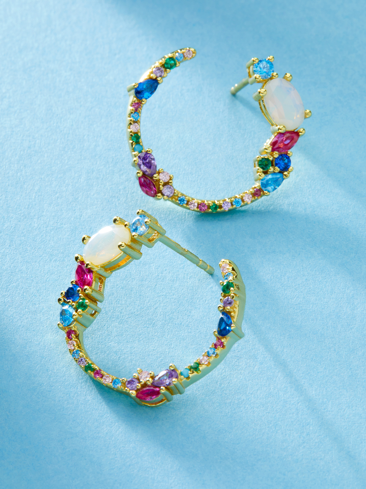 Pendiente circle Fiore. Plata de 1ª Ley baño en oro de 18k. Circonita clavada: rubi, aguamarina, rosa light, zafiro, esmeralda y opalo con efecto irisado. Cierre presión. Colección Fiore.