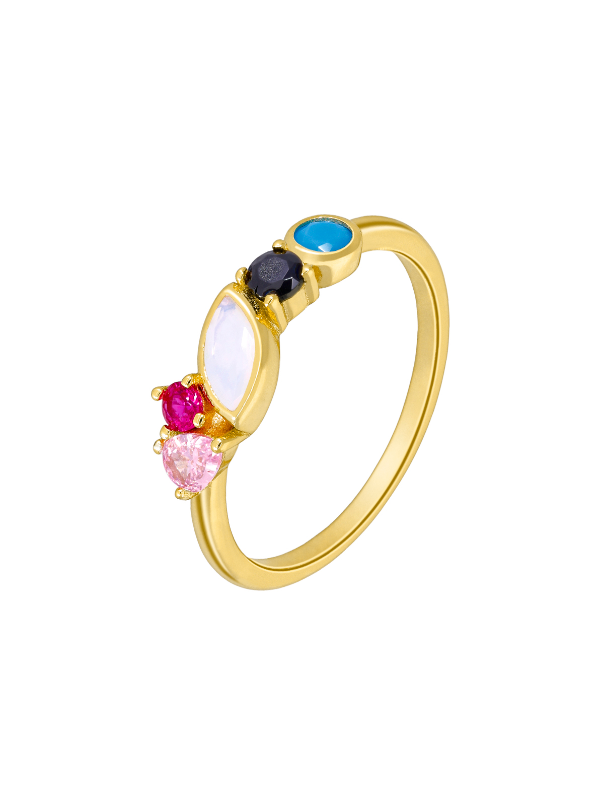 Anillo Fiore. Plata de 1ª Ley baño en oro de 18k. Circonita clavada: rose, turquesa, jet, rubi y opalo con efecto irisado. Colección Fiore.