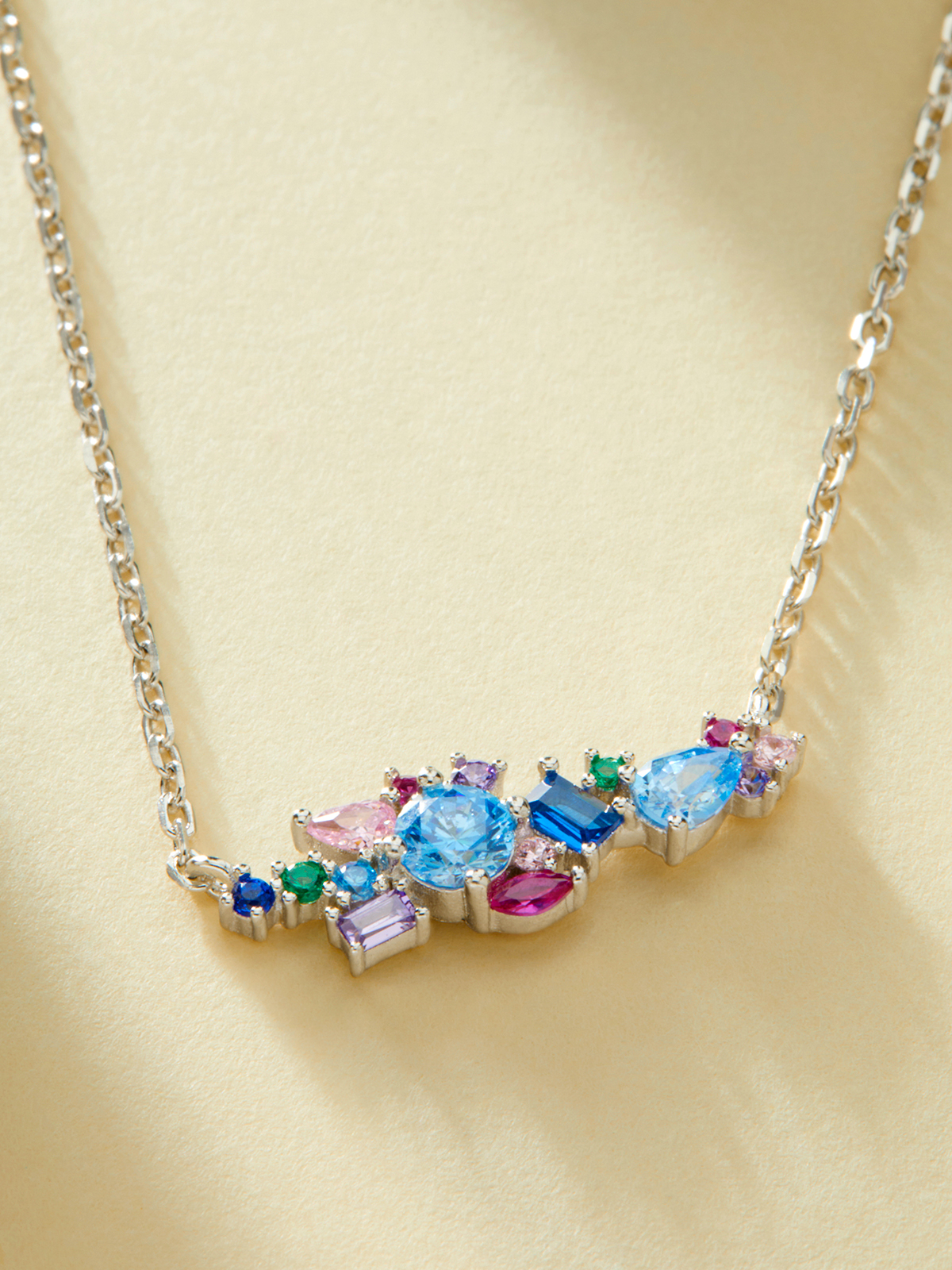 Collar Fiore. Plata de 1ª Ley rodiada. Circonita clavada: rubi, aguamarina, rosa light, zafiro y esmeralda. Cierre mosquetón. Cadena adaptable. Colección Fiore.