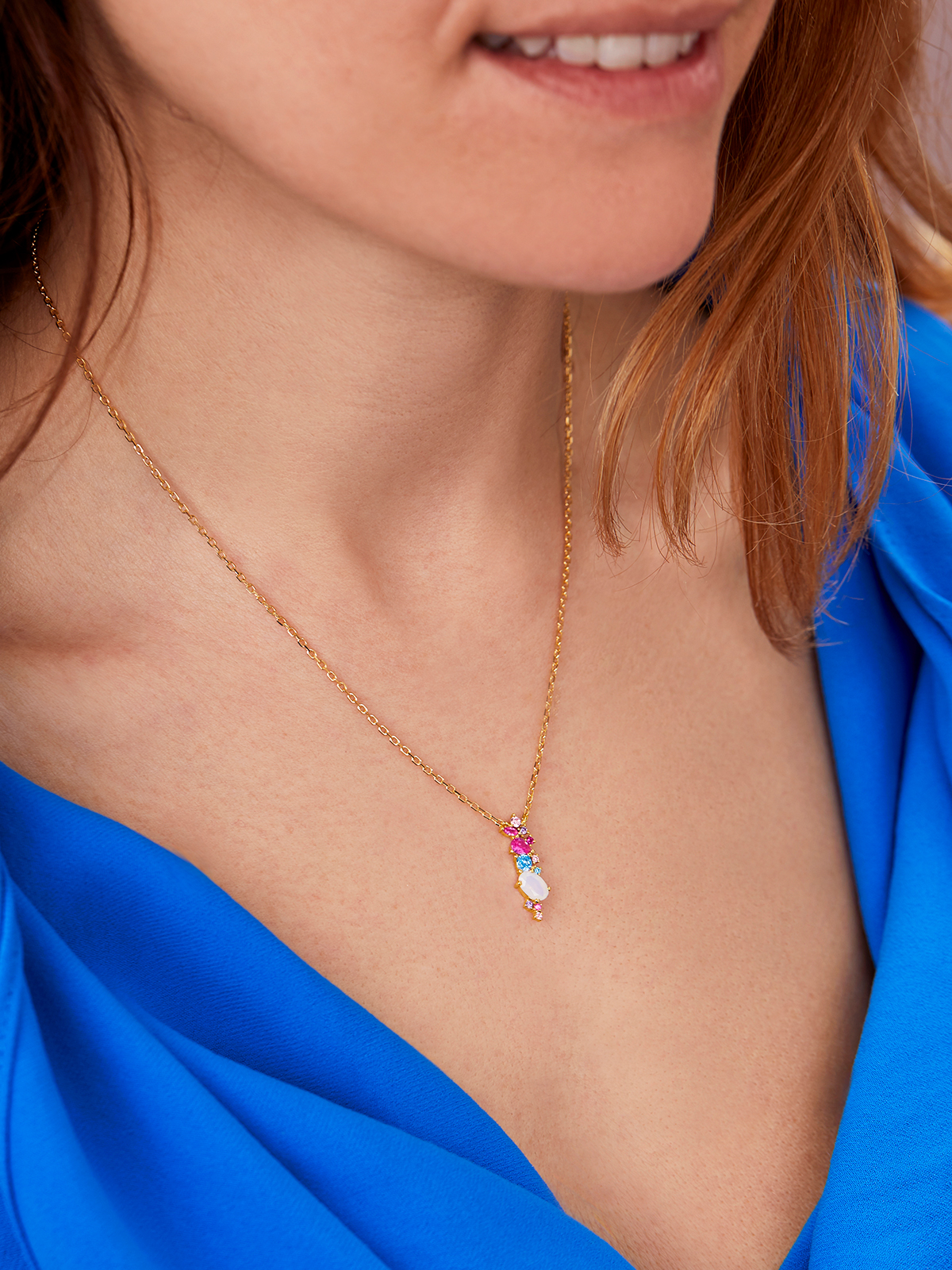 Collar cascada Fiore. Plata de 1ª Ley rodiada. Circonita clavada: rubi, aguamarina, rosa light y opalo con efecto irisado. Cierre mosquetón. Cadena adaptable. Colección Fiore.