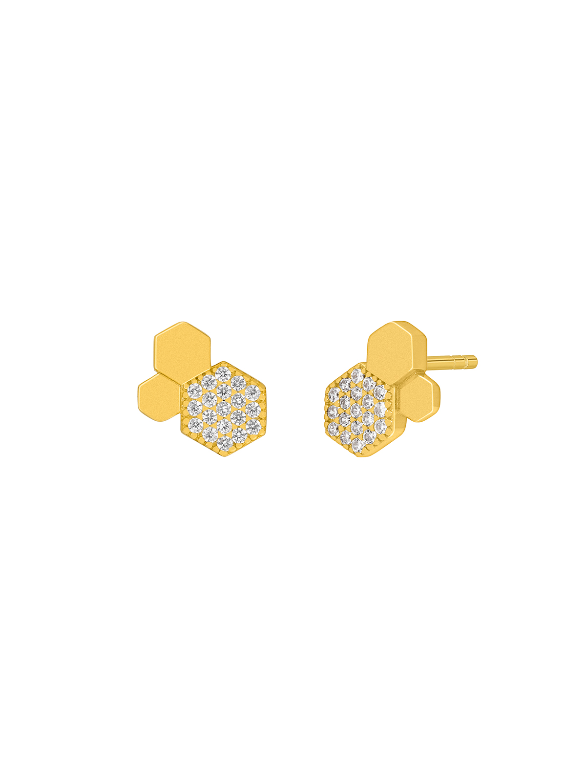 Pendientes hexagonal. Plata de 1ª Ley baño en oro de 18k. Circonitas en microengaste. Cierre presión.