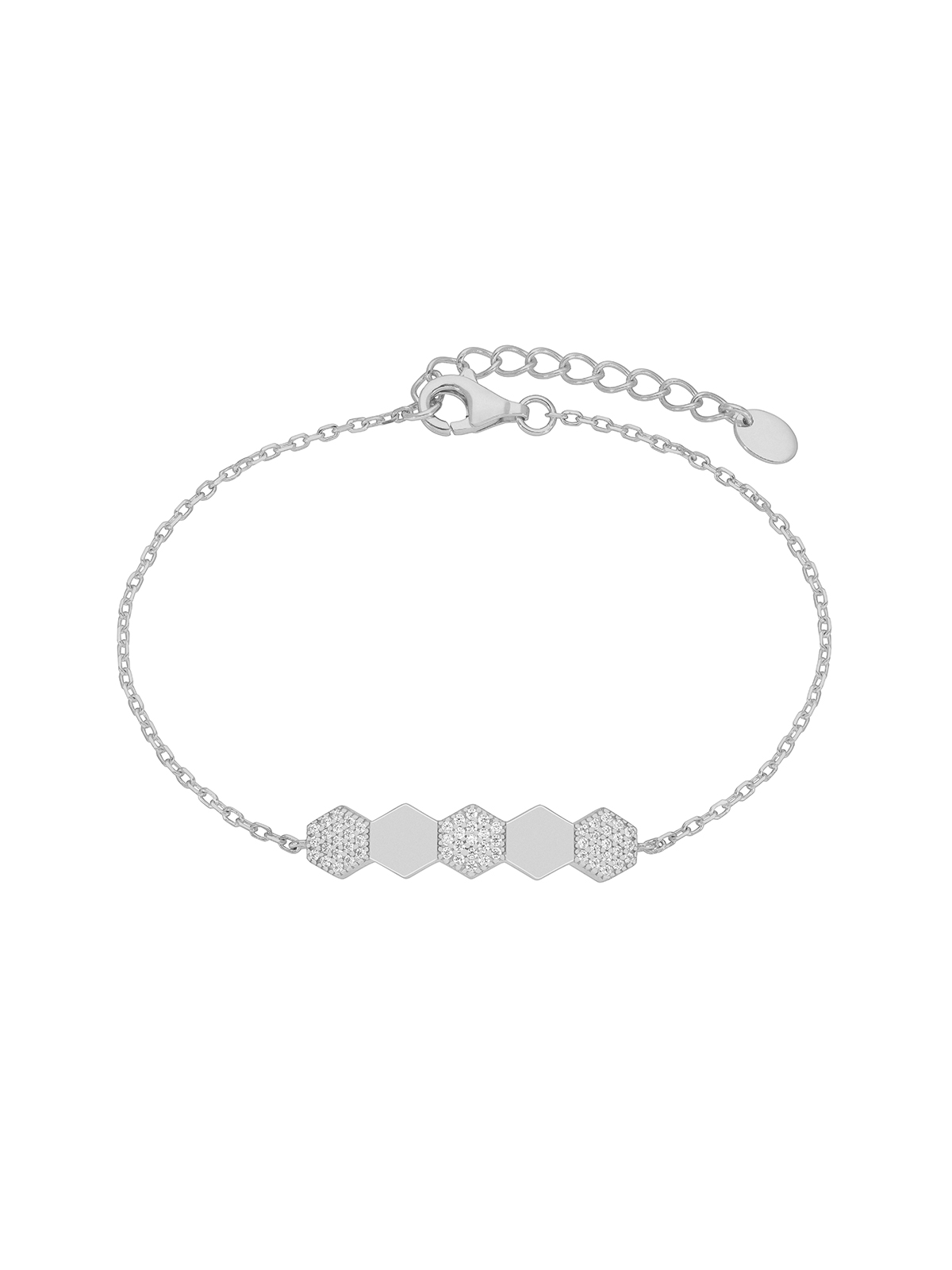 Pulsera hexagonal. Plata de 1ª Ley rodiada. Circonitas en microengaste. Cierre mosquetón. Cadena adaptable.